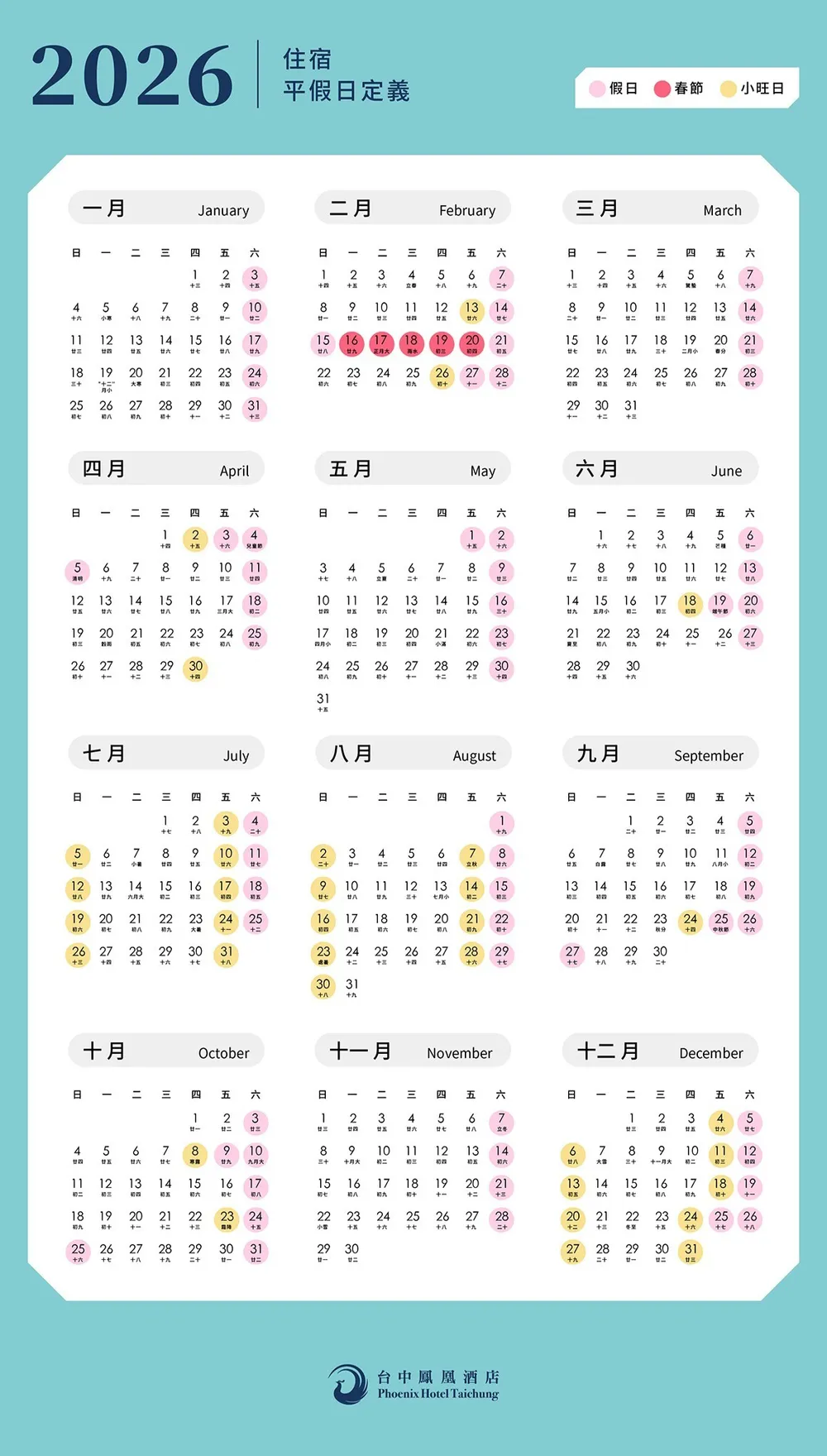 2026飯店平假日定義表(如有異動請依飯店公告為準)