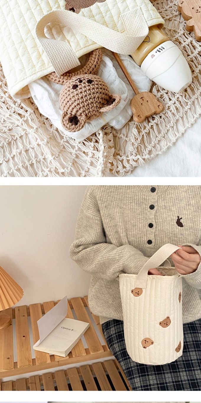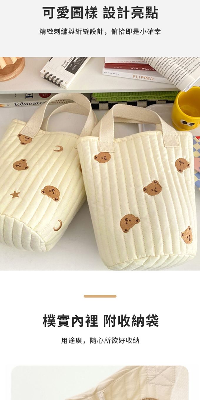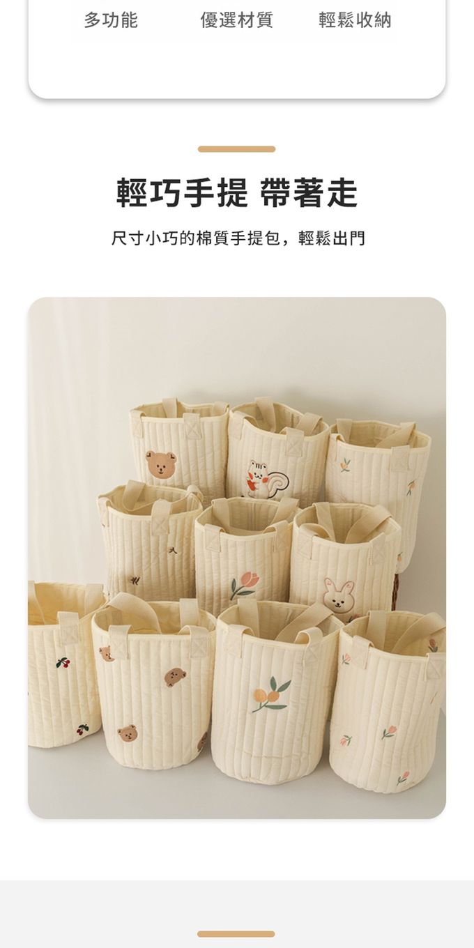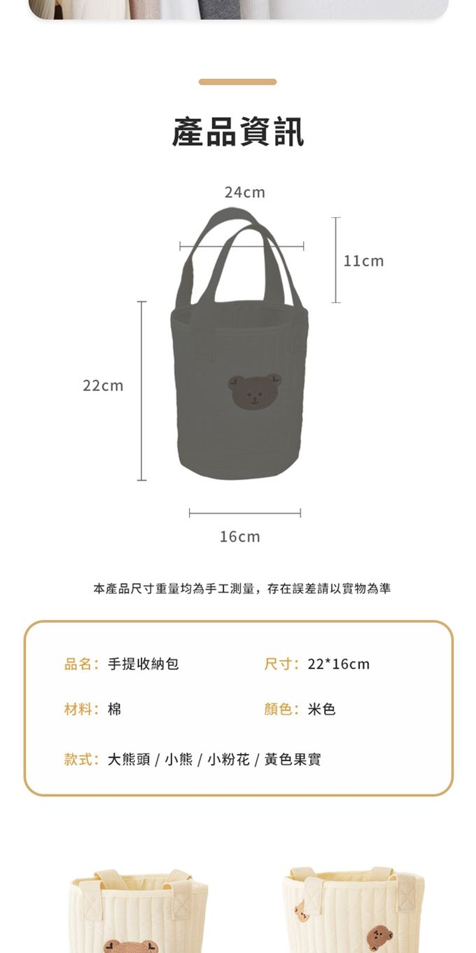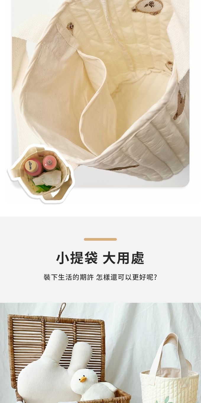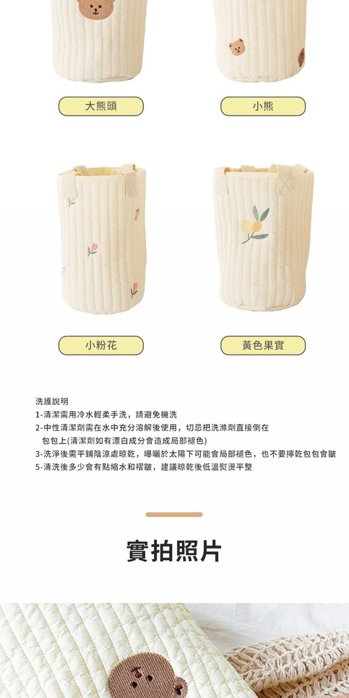 注意事項:1. 建議手洗,請勿機洗。 2. 小熊與小粉花款,為大批布料剪裁製作,圖案並非每一個袋子都一樣唷。