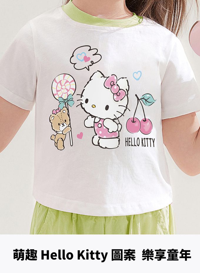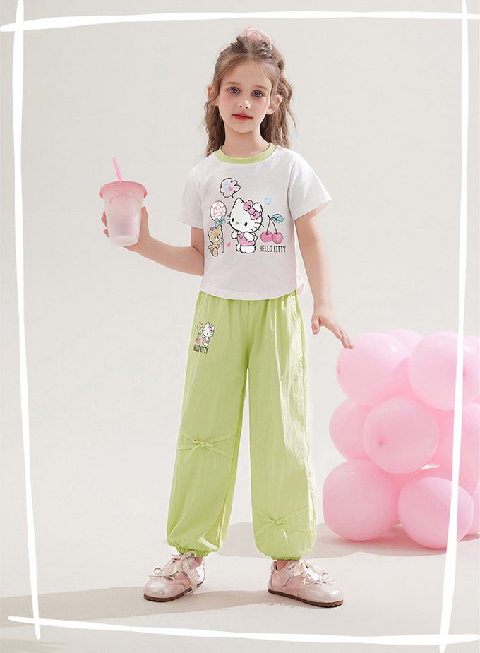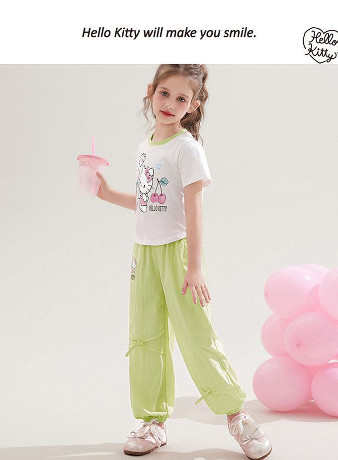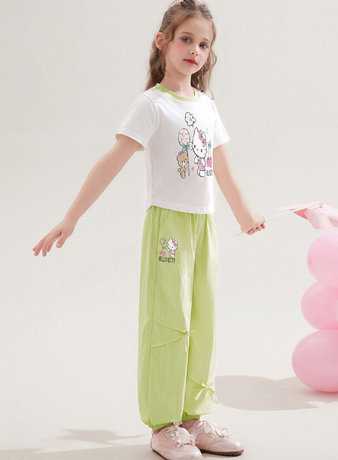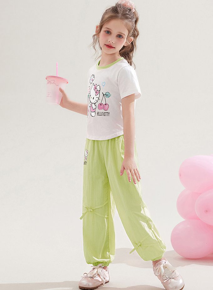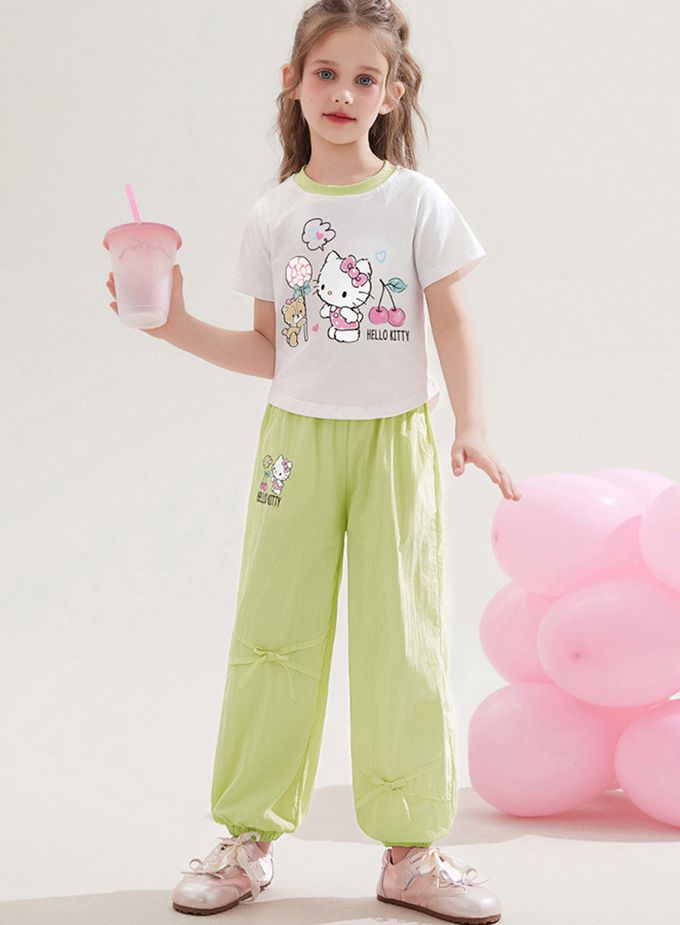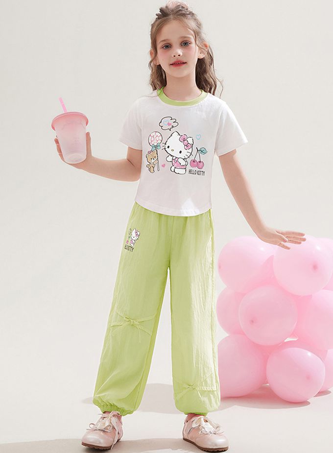 純棉圓領短袖上衣+蝴蝶結長褲套裝-卡通人物Hello Kitty-綠色
