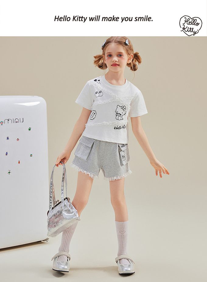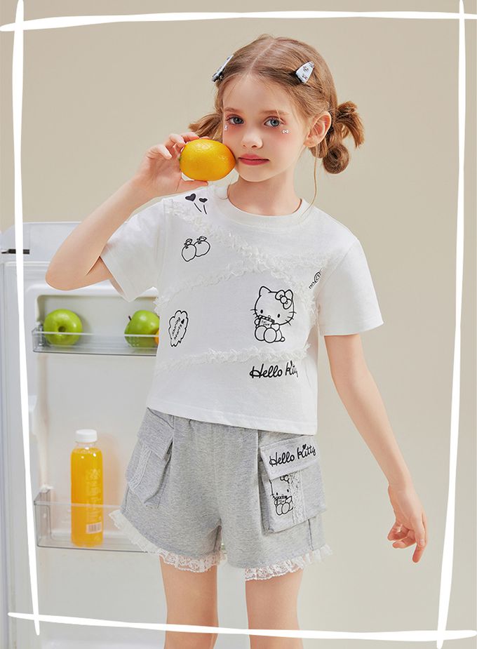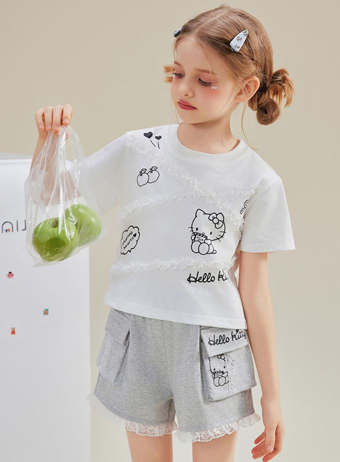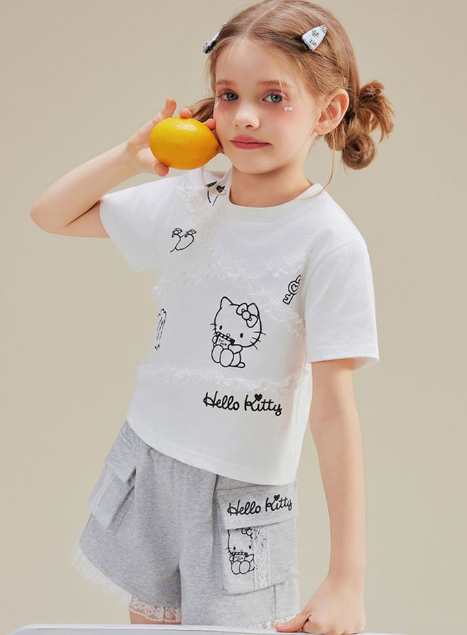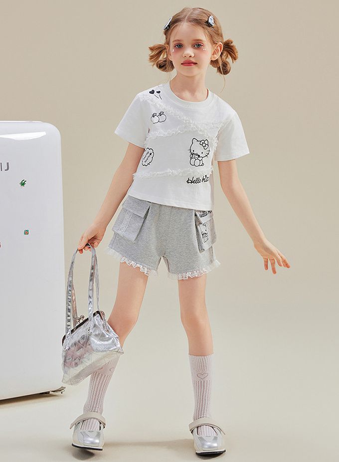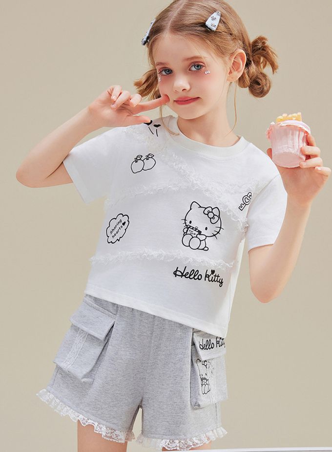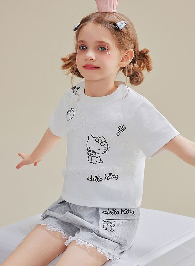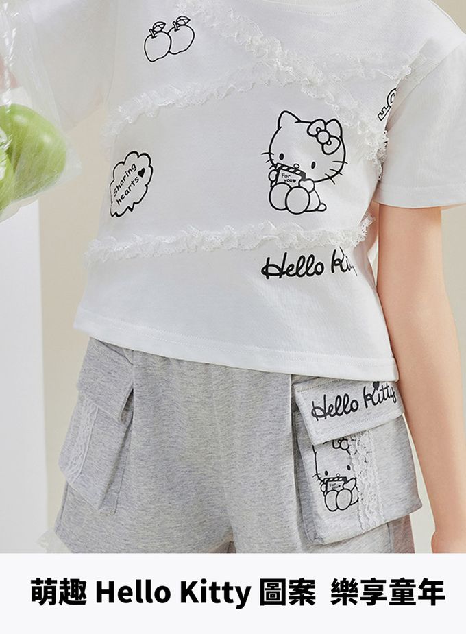 純棉蕾絲拼接短袖上衣+短褲套裝-卡通人物Hello Kitty-白色