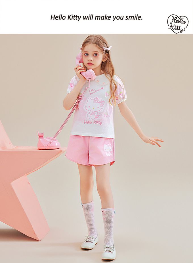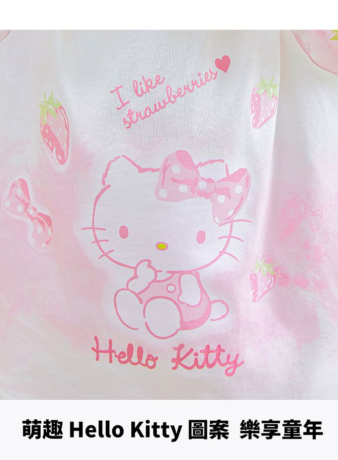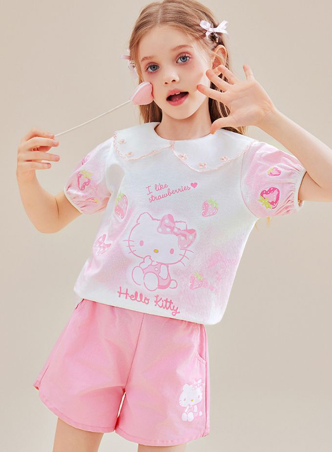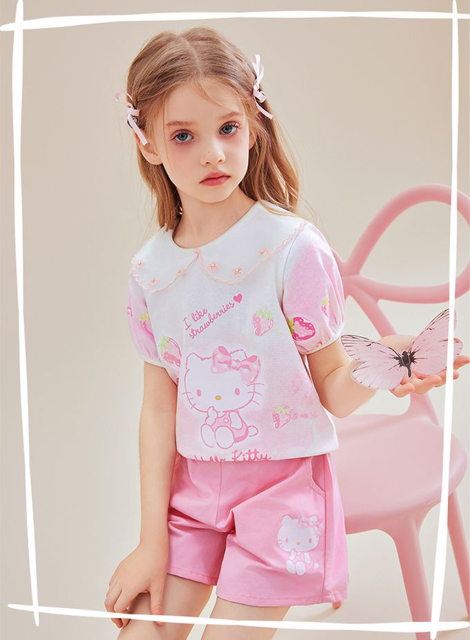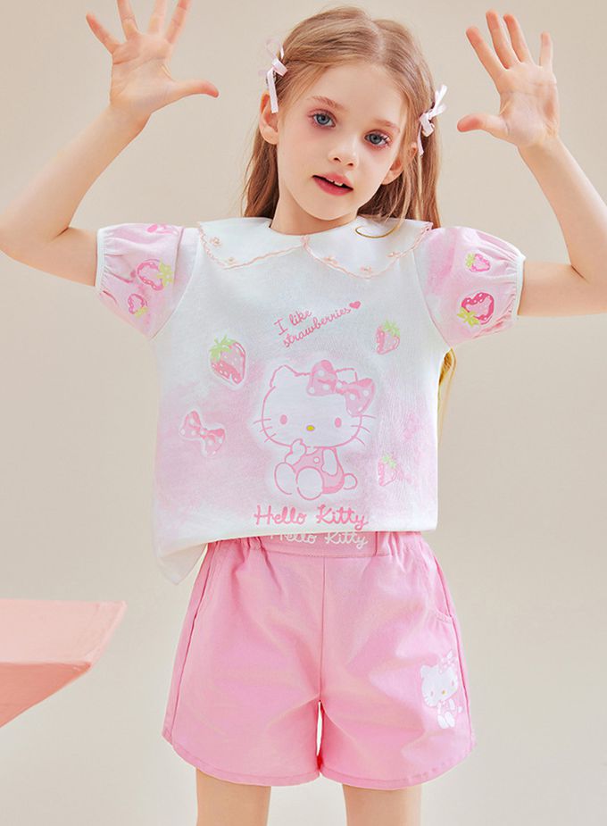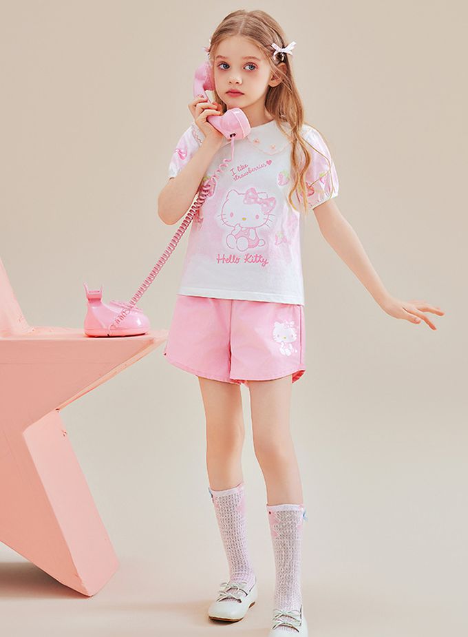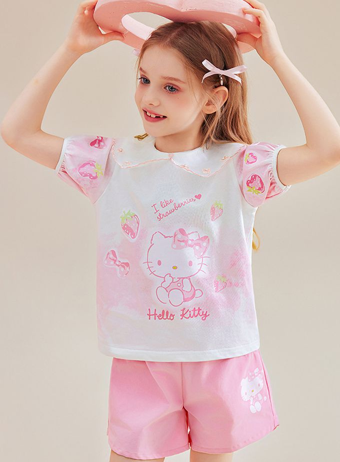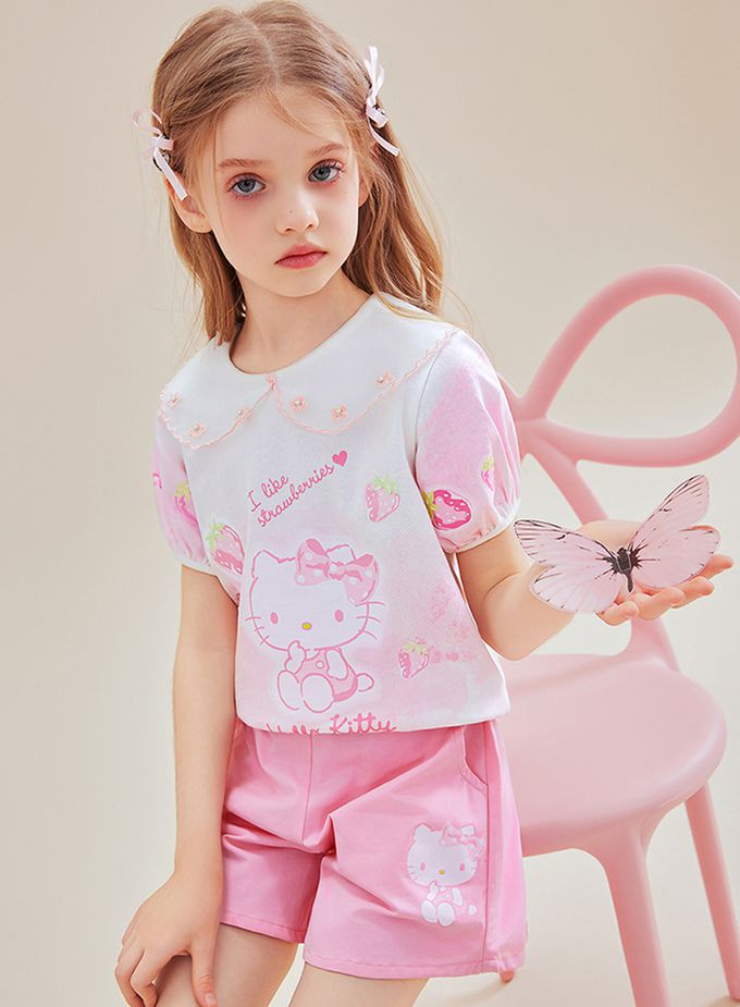 花邊翻領短袖上衣+短褲套裝-卡通人物Hello Kitty-粉色