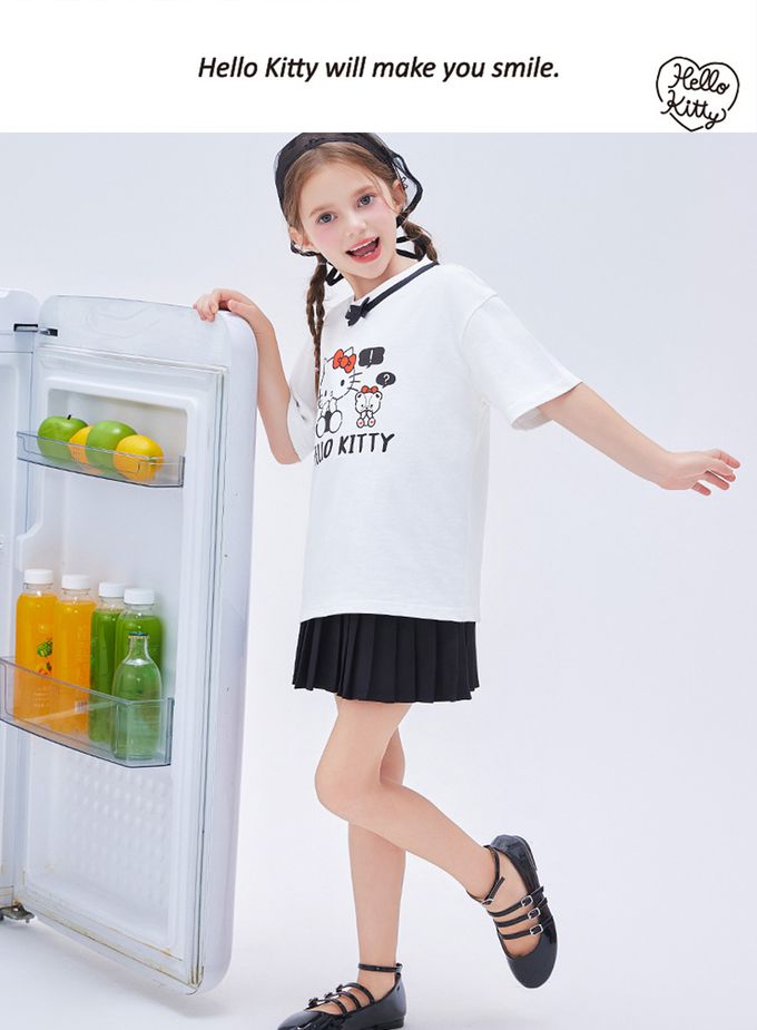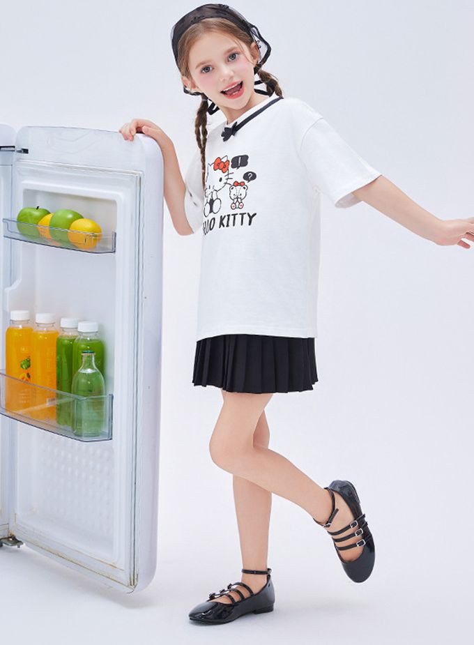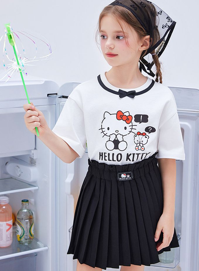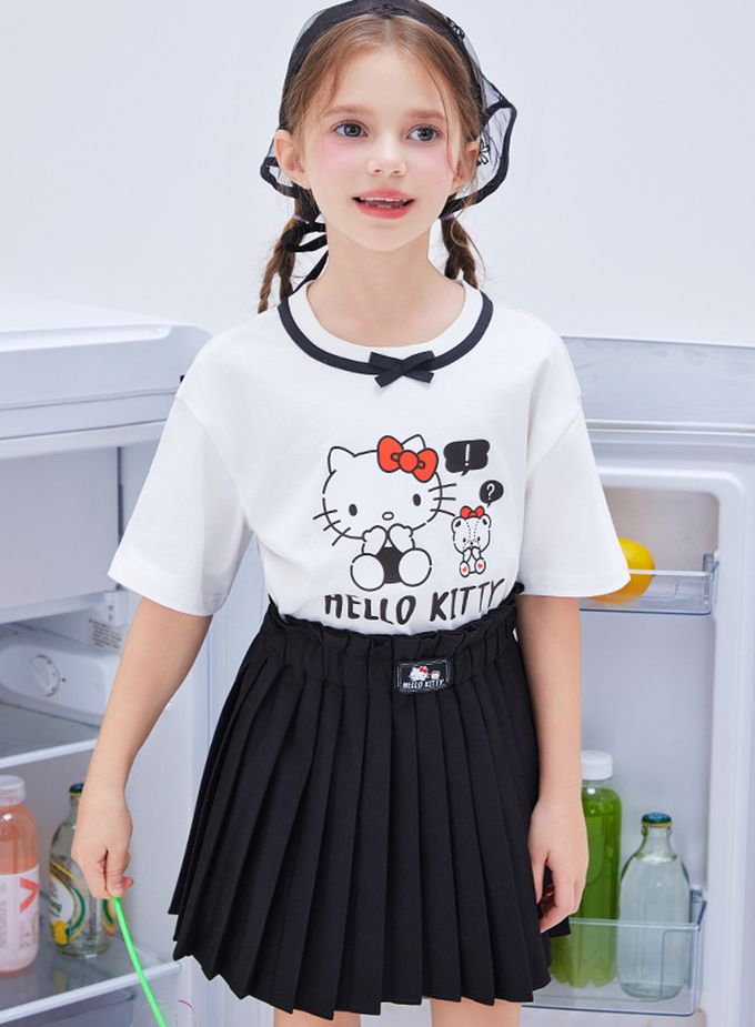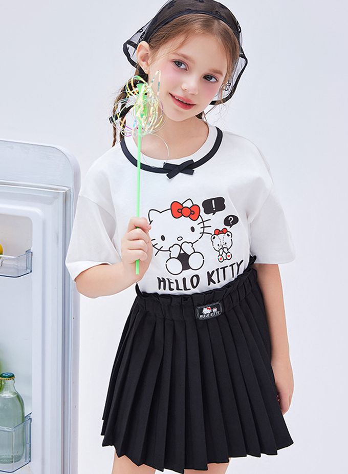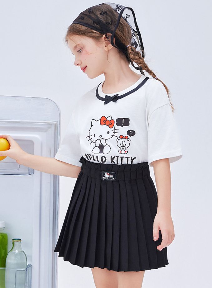 人氣卡通 - 蝴蝶領短袖上衣+百褶短裙套裝-卡通人物Hello Kitty-白色