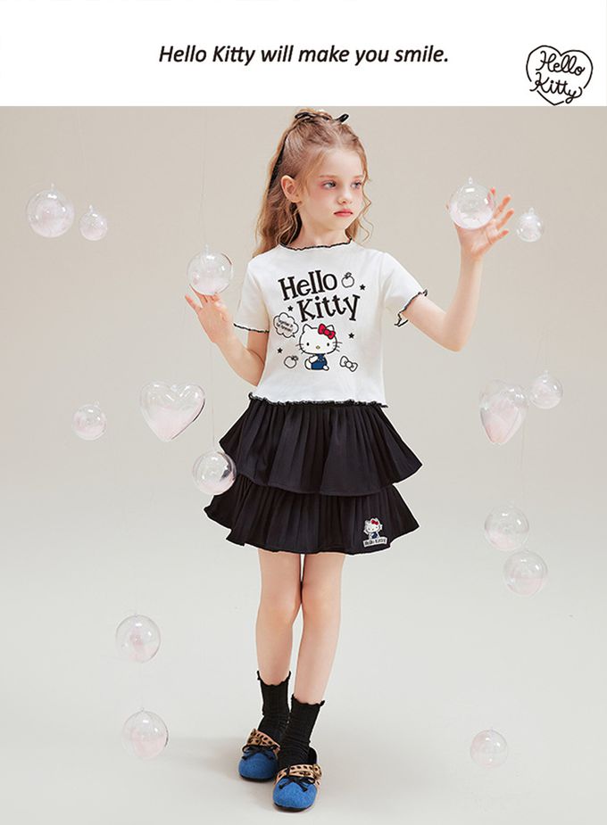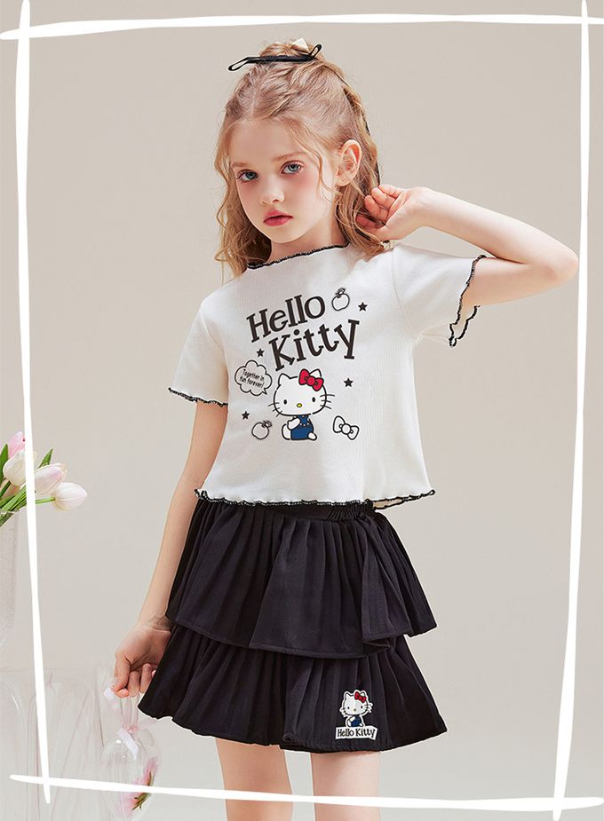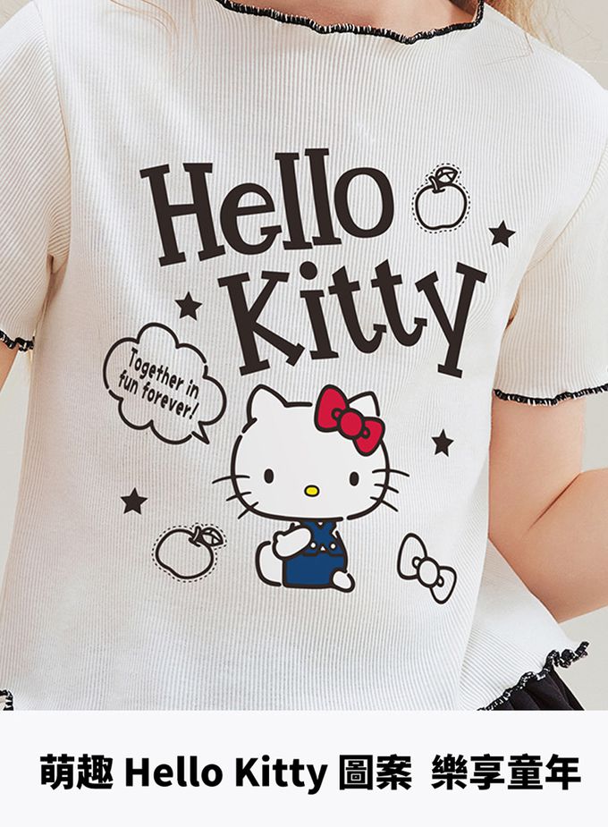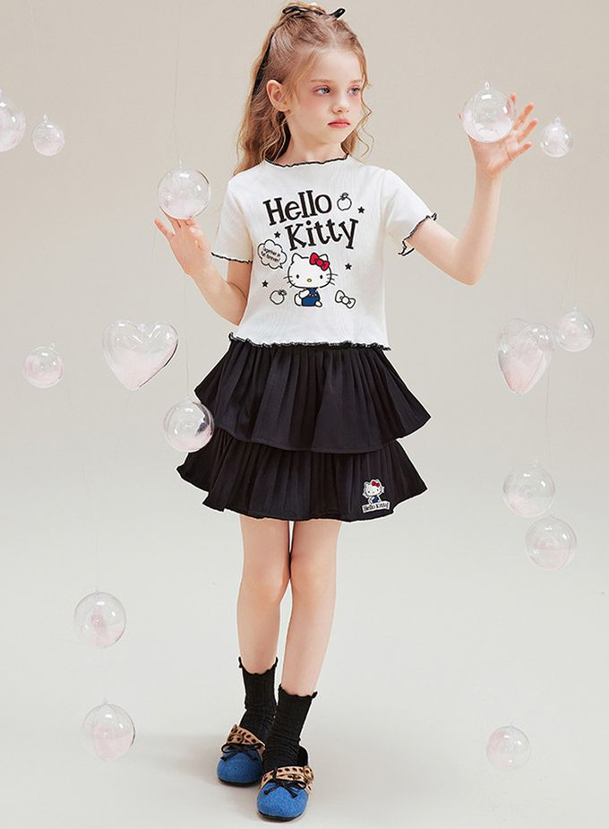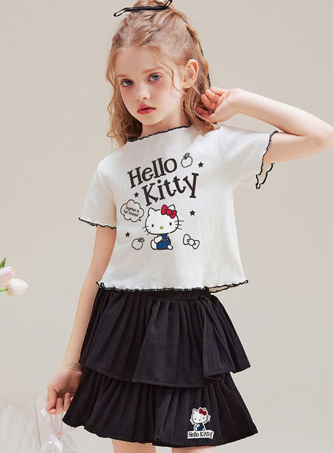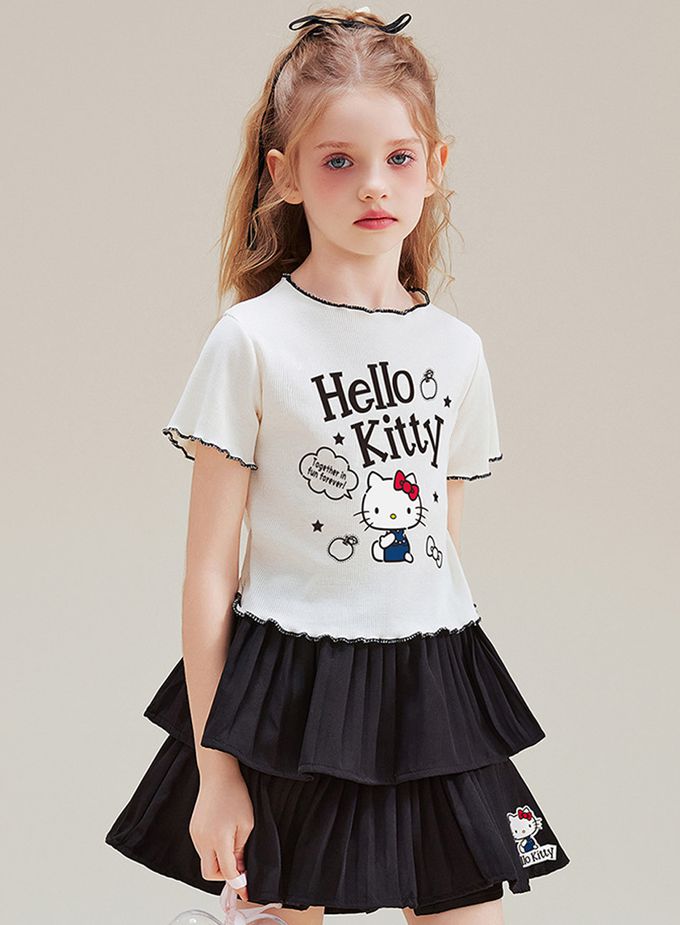 木耳邊短袖上衣+層次短裙套裝-卡通人物Hello Kitty-米杏