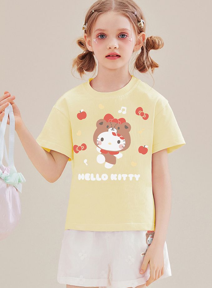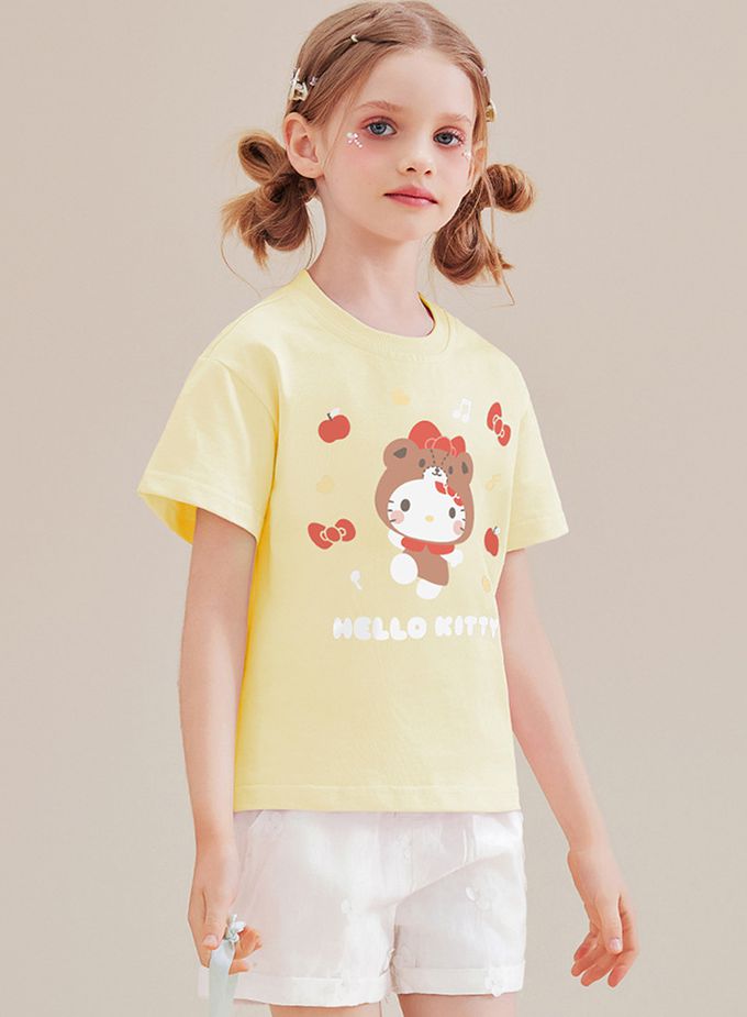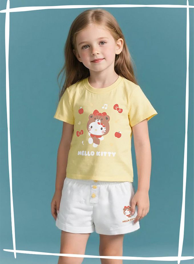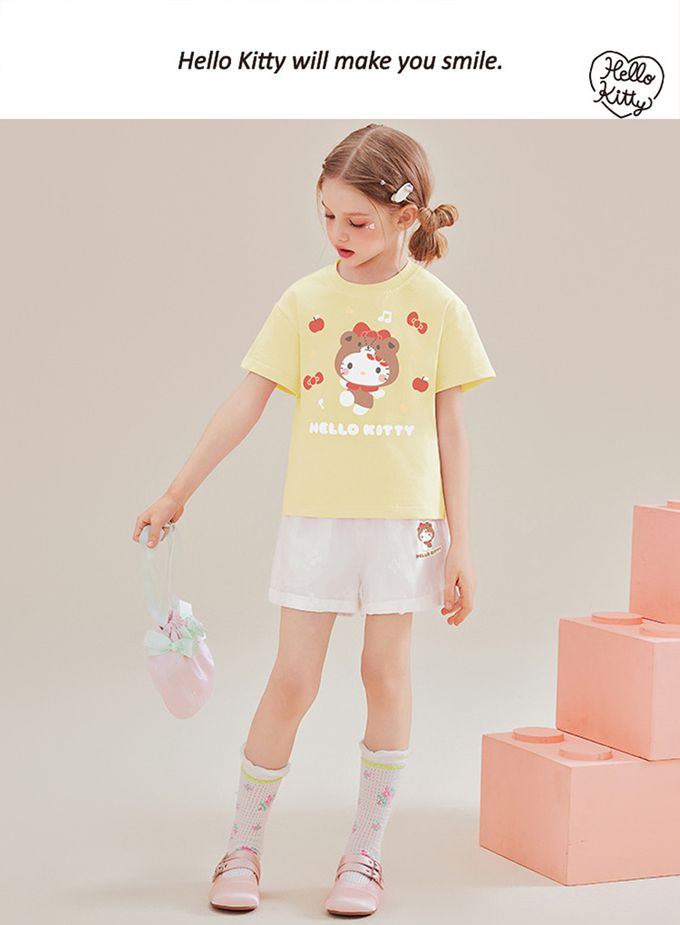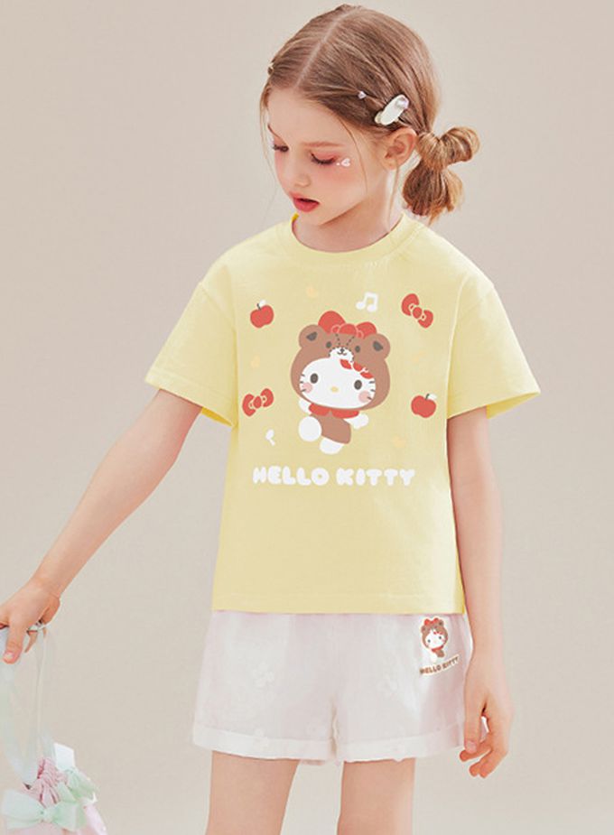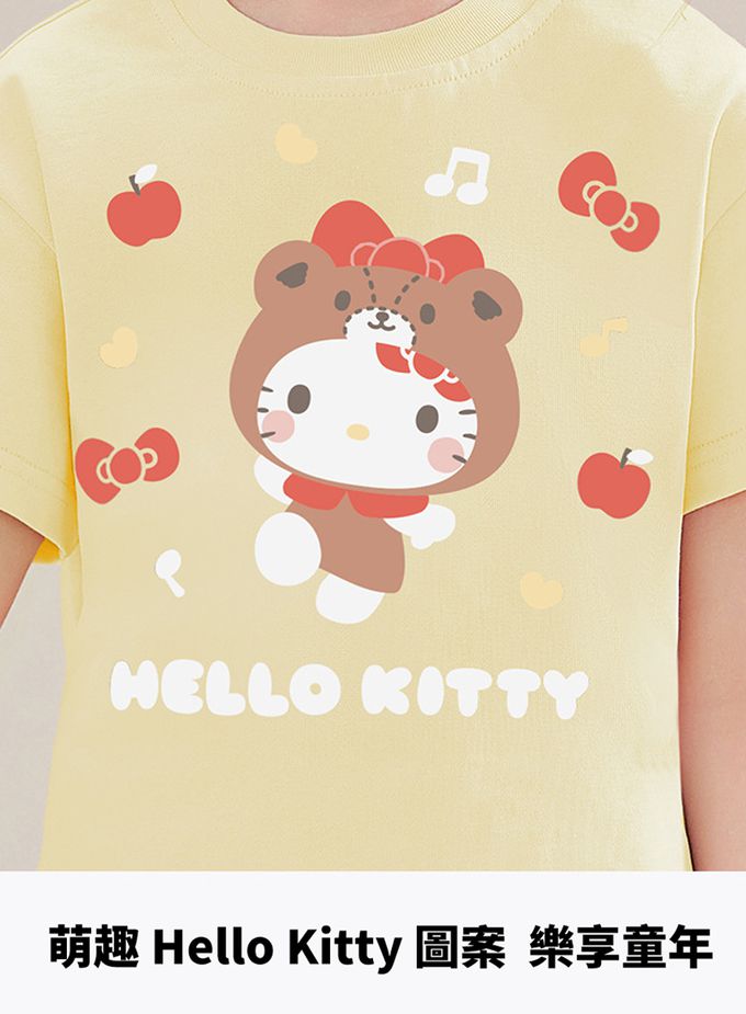 純棉圓領短袖上衣+短褲套裝-卡通人物Hello Kitty-黃色