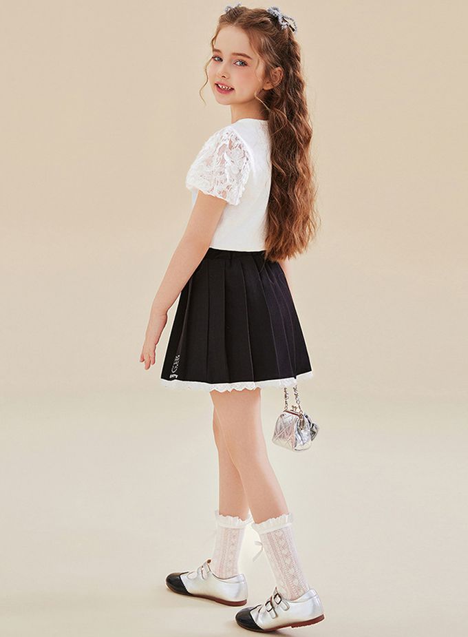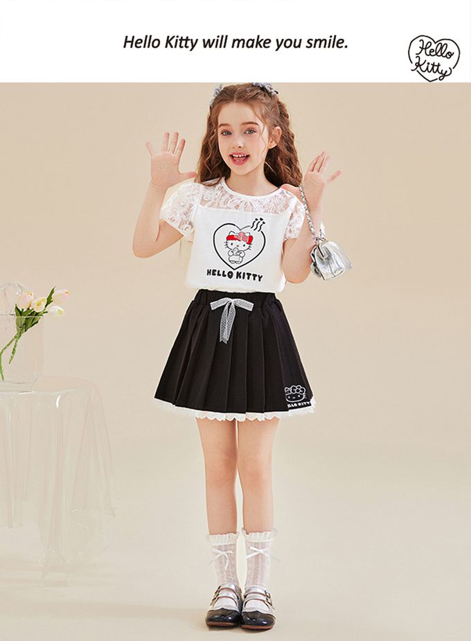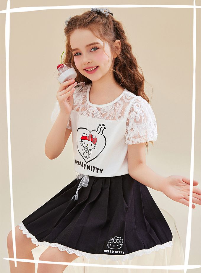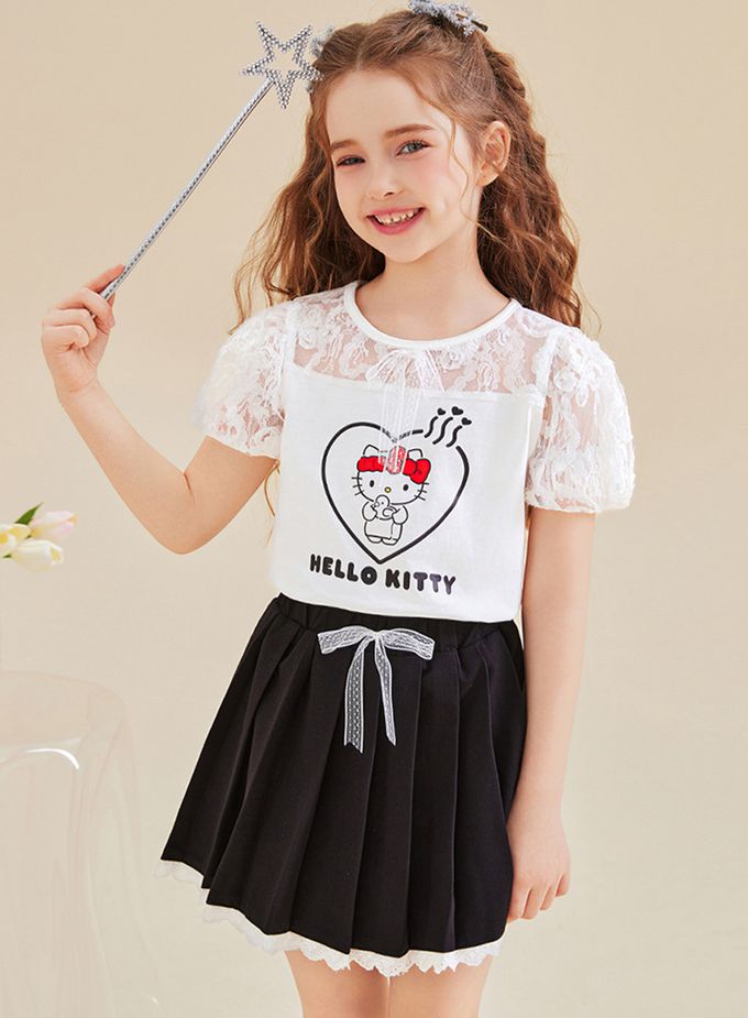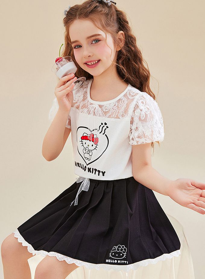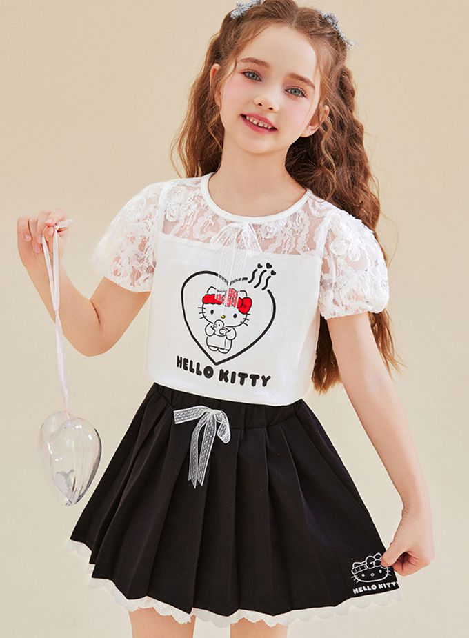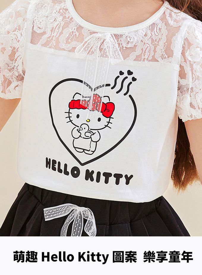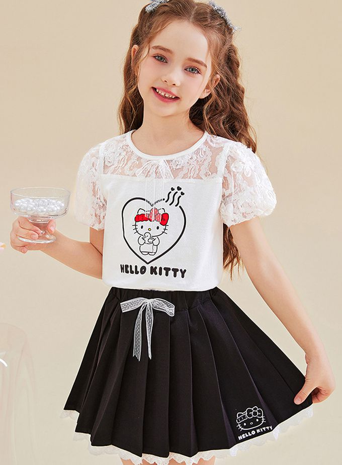 鏤空蕾絲短袖上衣+短裙套裝-卡通人物Hello Kitty-白色