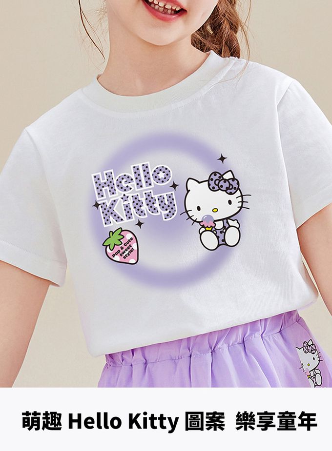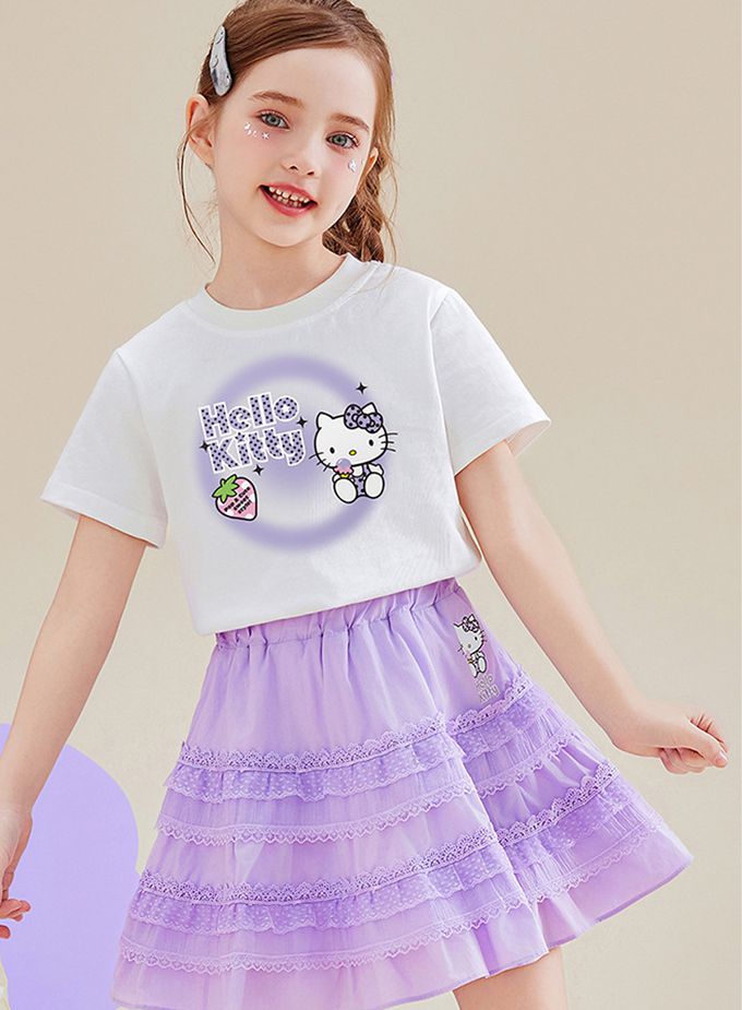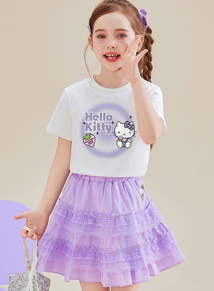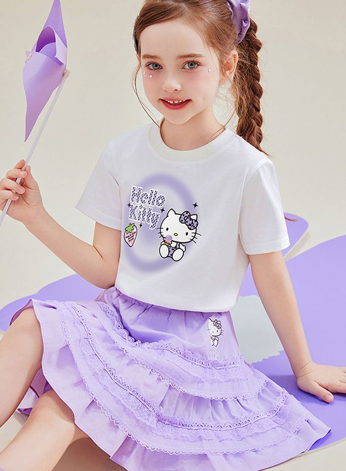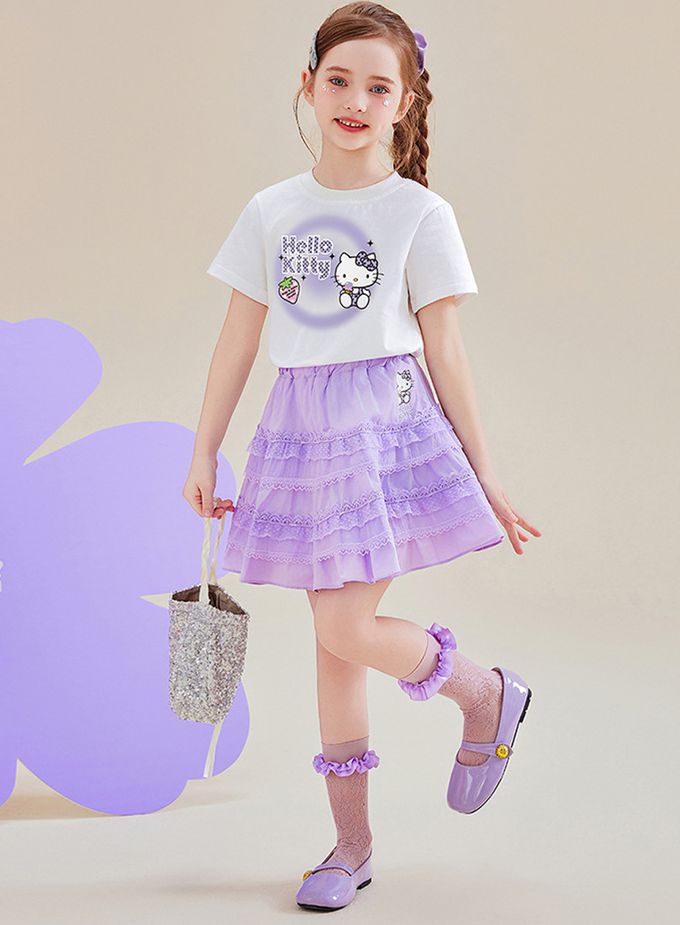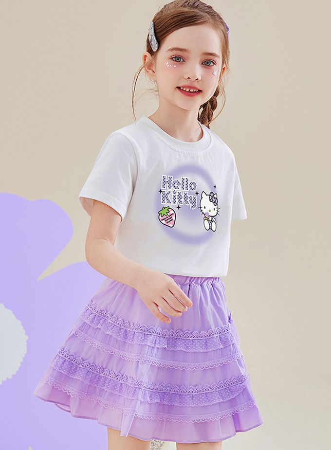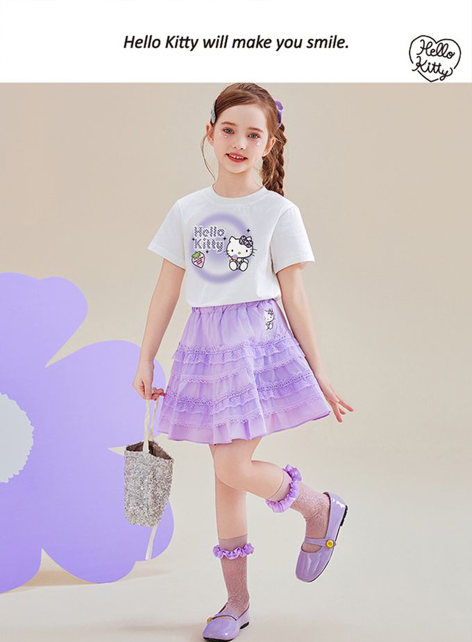純棉短袖上衣+蕾絲拼接短裙套裝-卡通人物Hello Kitty-紫色