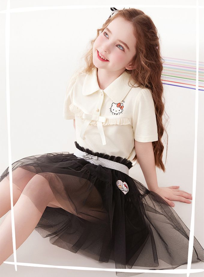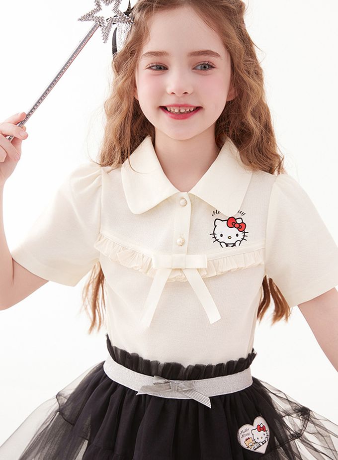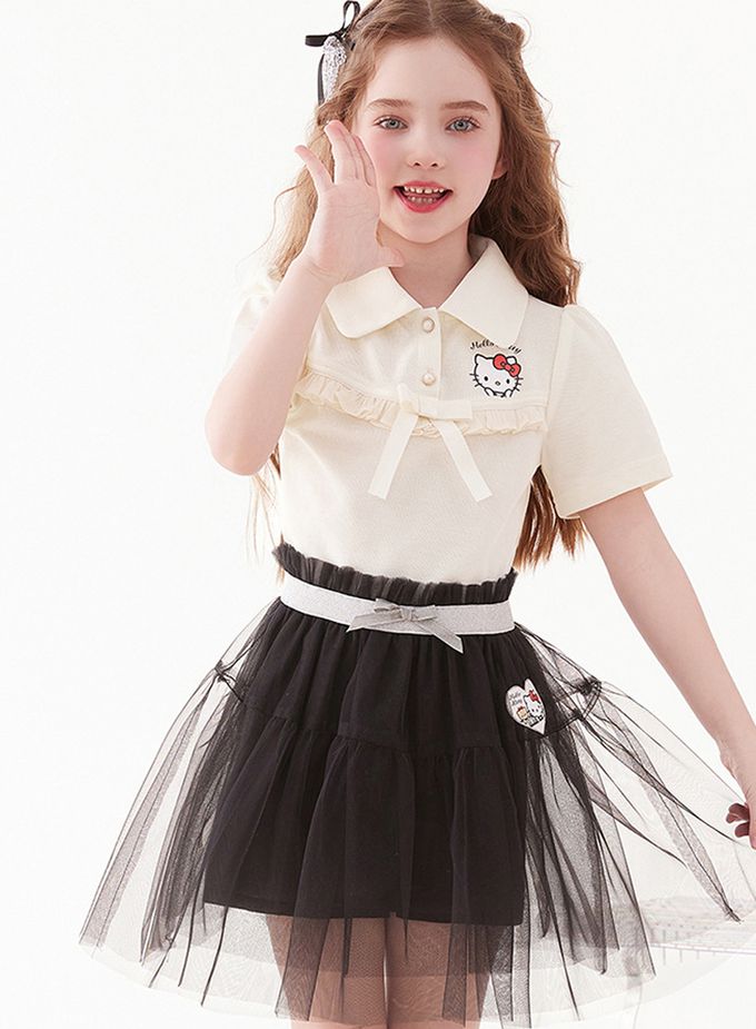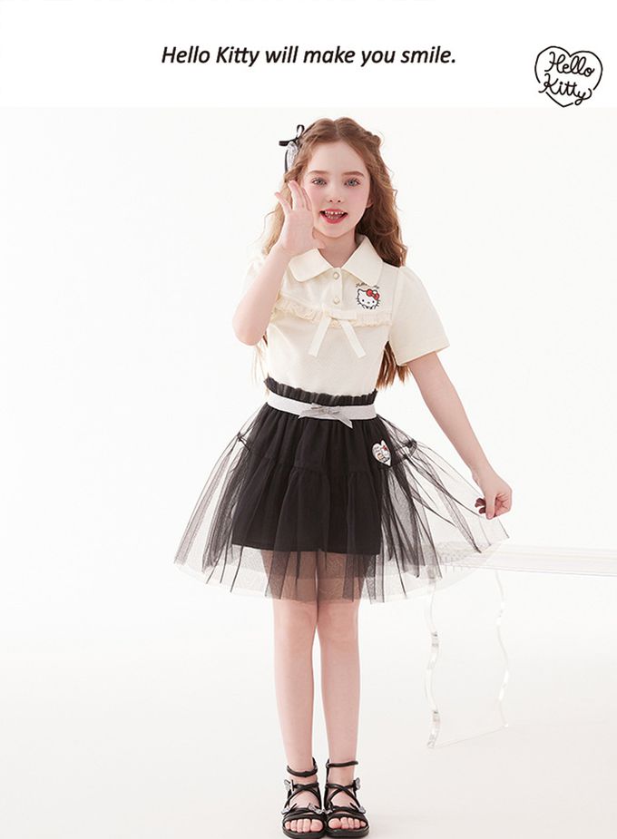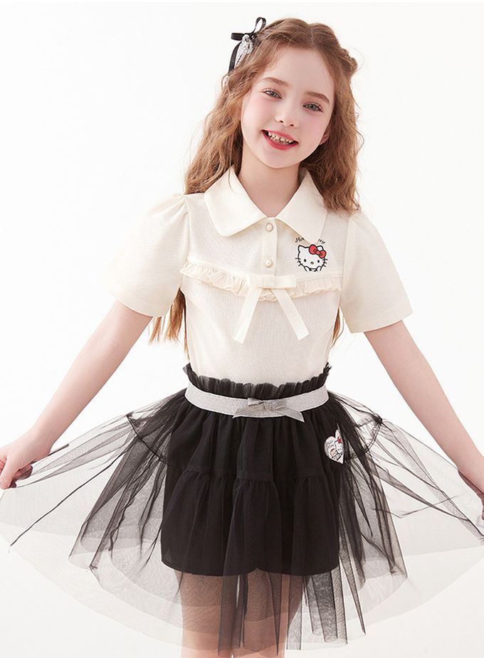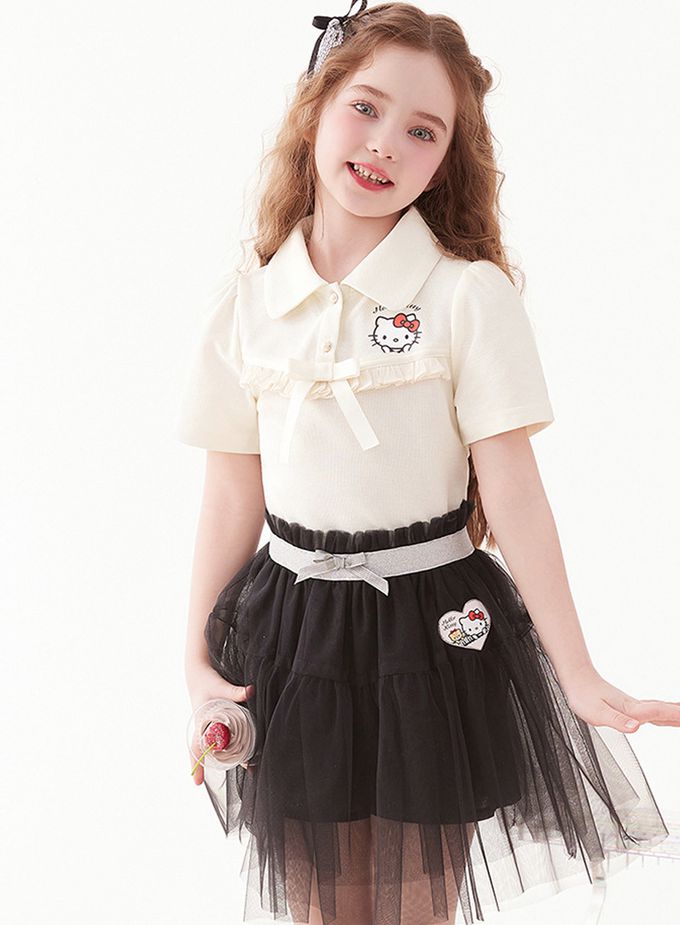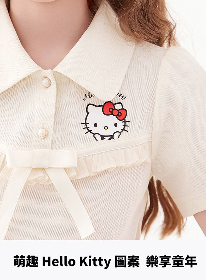 翻領短袖上衣+甜心紗裙套裝-卡通人物Hello Kitty-米杏