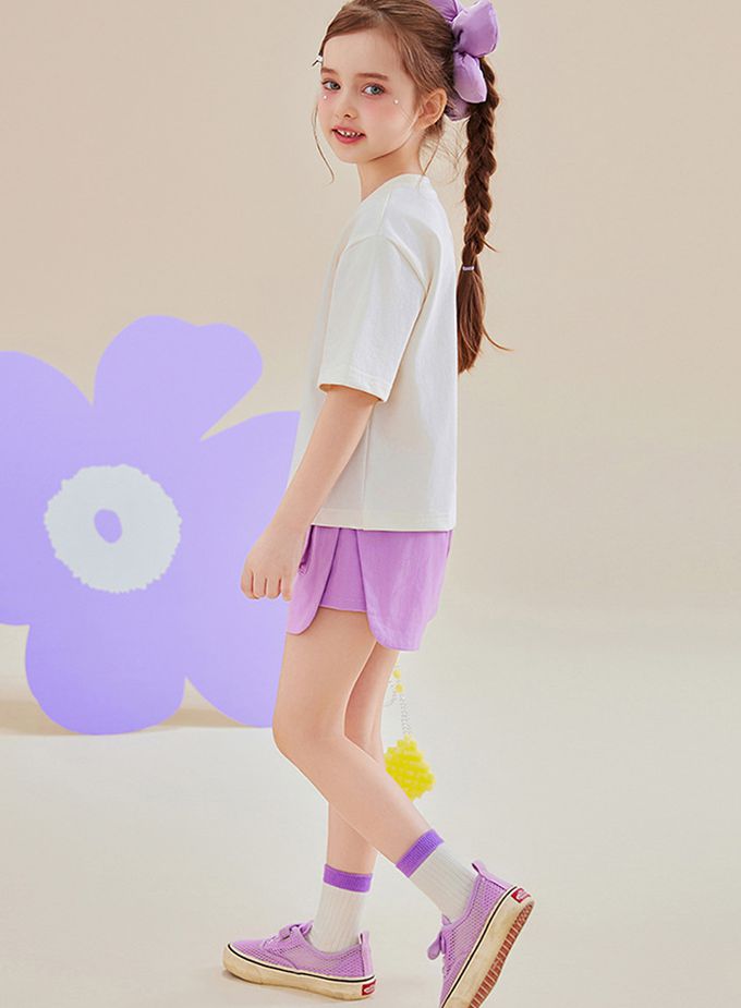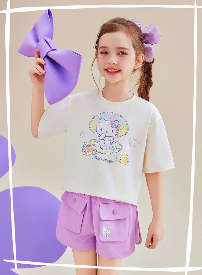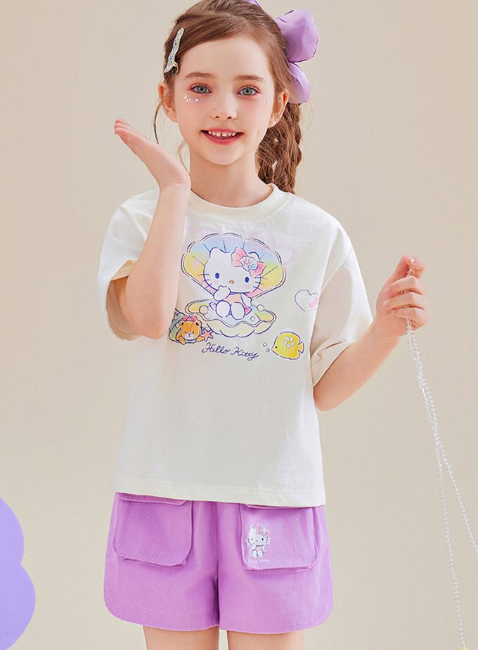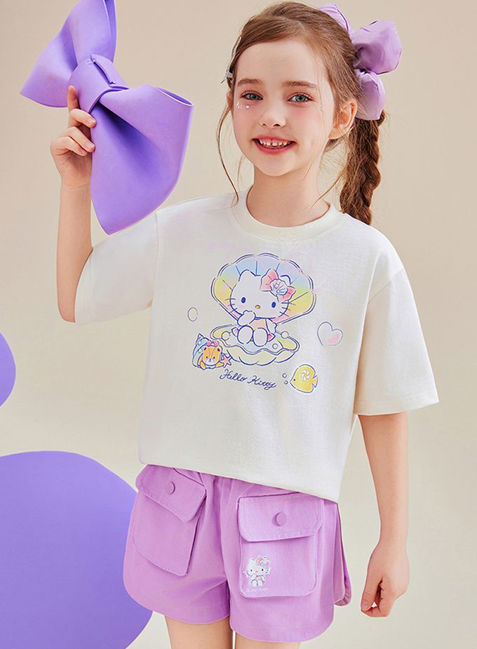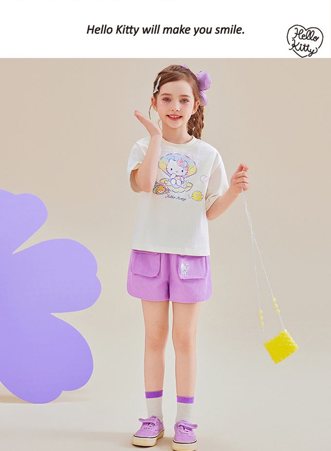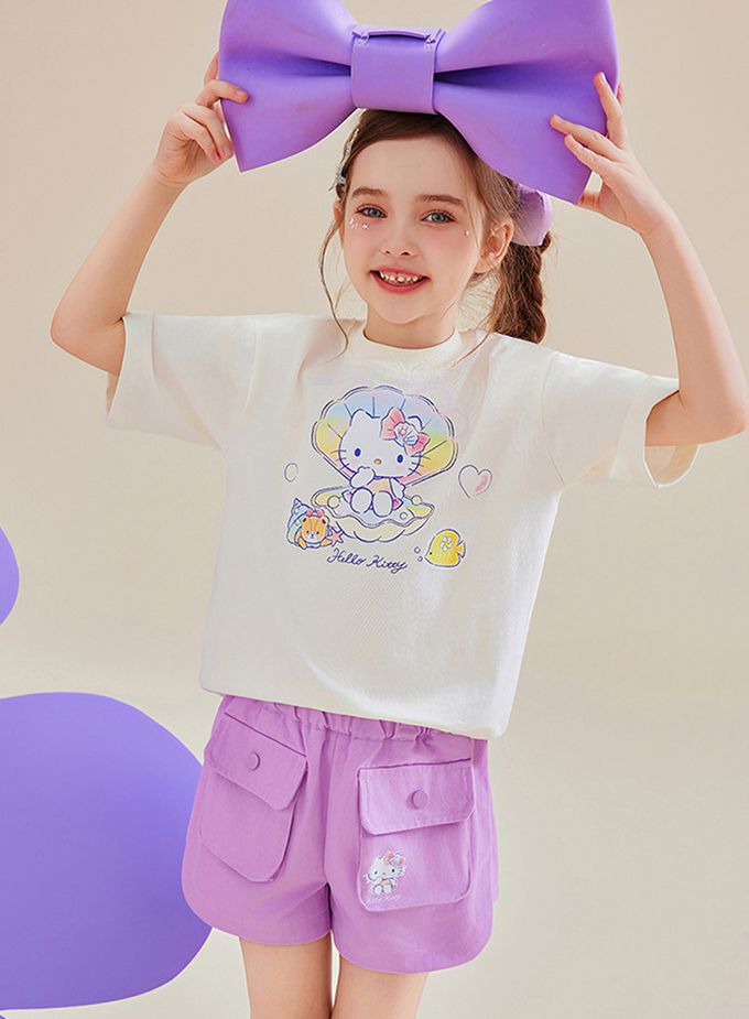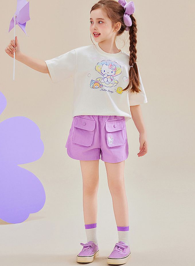 純棉短袖上衣+造型口袋短褲套裝-卡通人物Hello Kitty-紫色