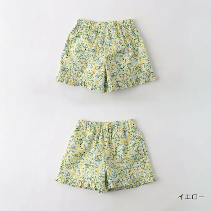 日本 BRANSHES - 清爽可愛摺邊後口袋短褲-花卉-黃綠