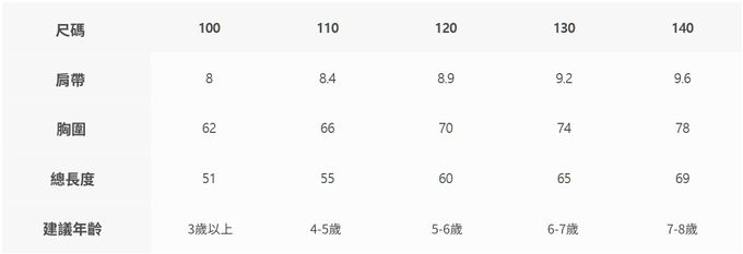 2. 尺寸表乃依平均值制定,每位孩童發育情形不同,請參考模特試穿資訊、既有衣物等,並依實際測量結果為準。
