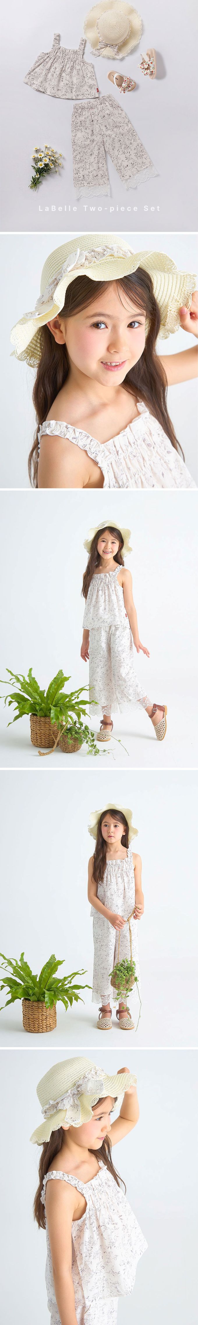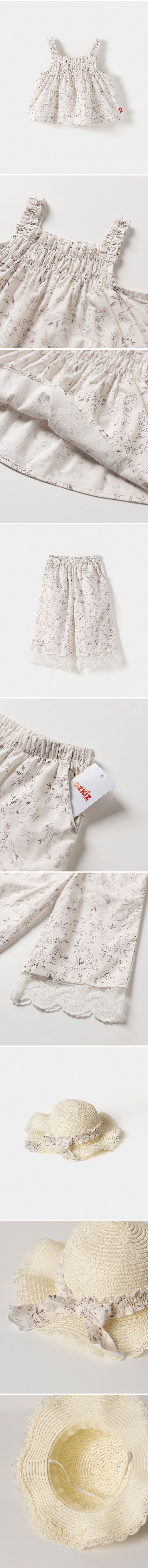 韓國 OZKIZ - (附帽子)雅緻花紋抓褶感細肩帶上衣X寬褲套裝-象牙白