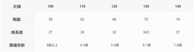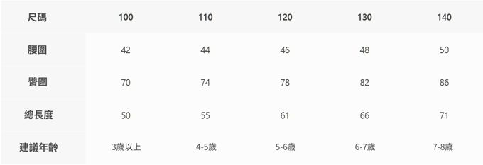 2. 尺寸表乃依平均值制定,每位孩童發育情形不同,請參考模特試穿資訊、既有衣物等,並依實際測量結果為準。