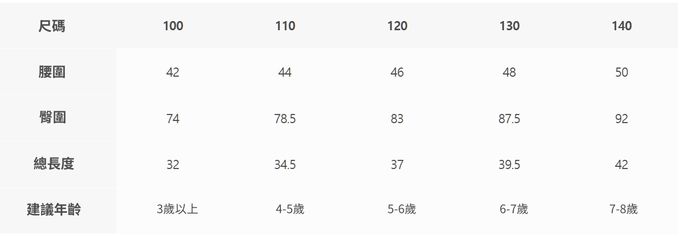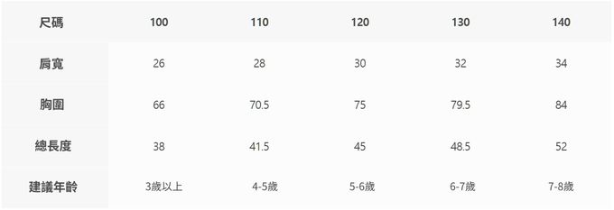 2. 尺寸表乃依平均值制定,每位孩童發育情形不同,請參考模特試穿資訊、既有衣物等,並依實際測量結果為準。