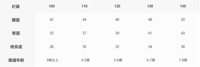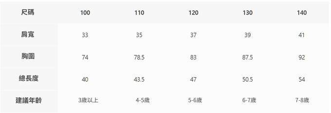 2. 尺寸表乃依平均值制定,每位孩童發育情形不同,請參考模特試穿資訊、既有衣物等,並依實際測量結果為準。