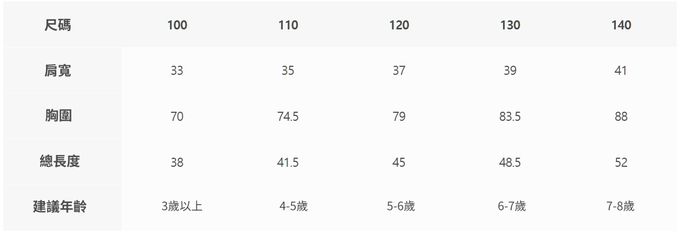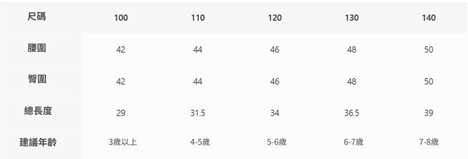 2. 尺寸表乃依平均值制定,每位孩童發育情形不同,請參考模特試穿資訊、既有衣物等,並依實際測量結果為準。