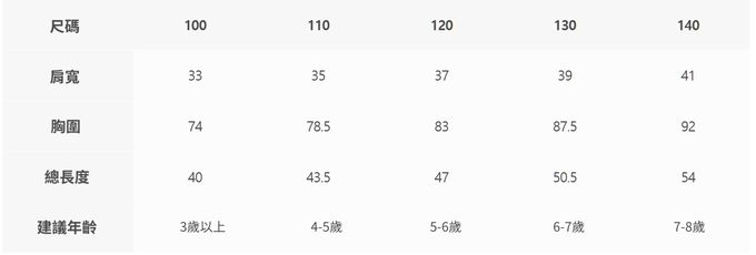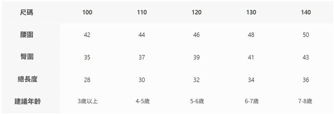 2. 尺寸表乃依平均值制定,每位孩童發育情形不同,請參考模特試穿資訊、既有衣物等,並依實際測量結果為準。