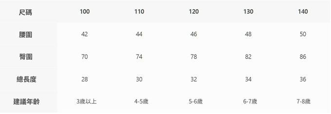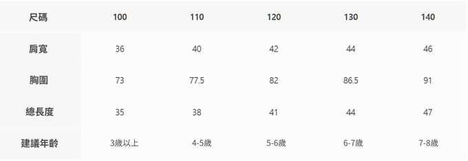 2. 尺寸表乃依平均值制定,每位孩童發育情形不同,請參考模特試穿資訊、既有衣物等,並依實際測量結果為準。