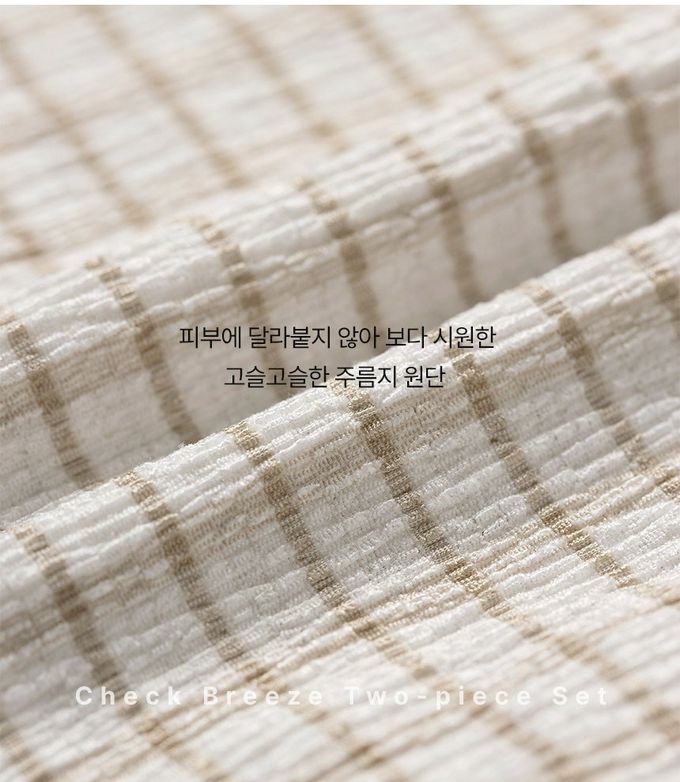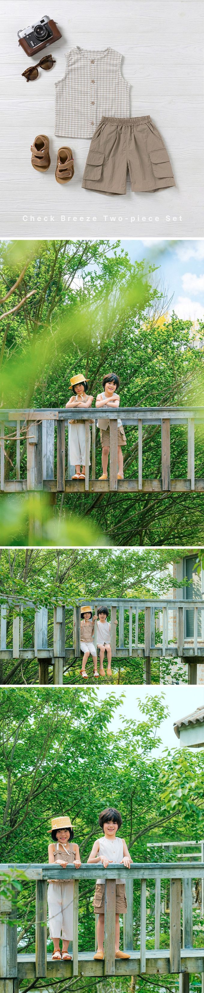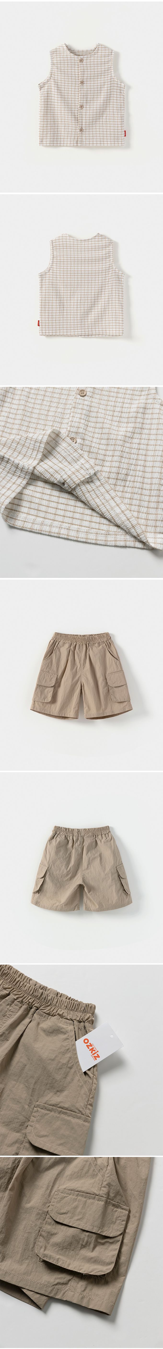 韓國 OZKIZ - 皺摺感格紋背心X工裝短褲套裝-米X卡其棕