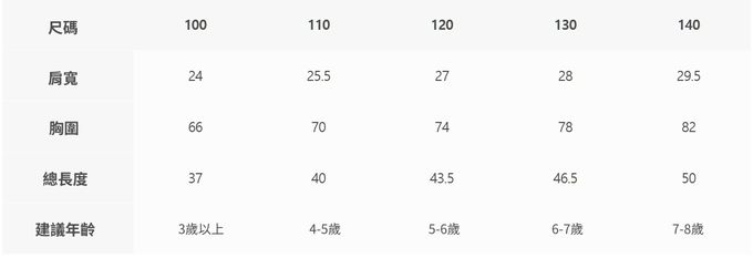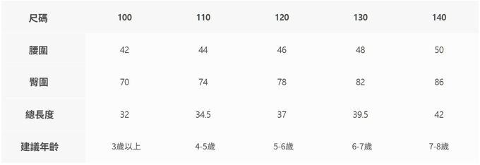 2. 尺寸表乃依平均值制定,每位孩童發育情形不同,請參考模特試穿資訊、既有衣物等,並依實際測量結果為準。