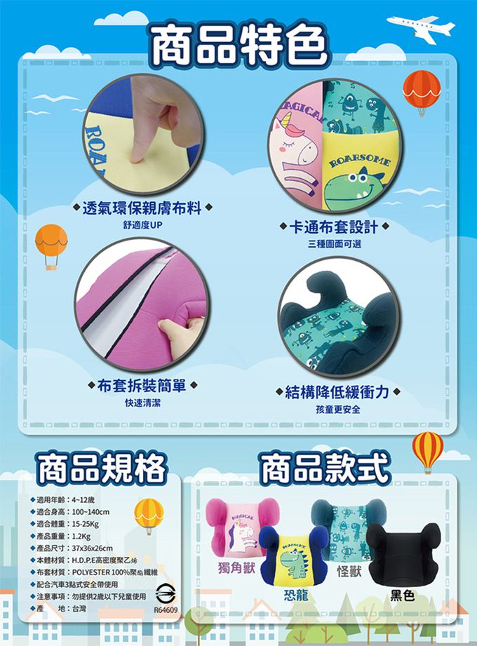 注意事項:【商品規格】 《防掉落繩》 適用年齡:6個月以上 主要材質:FDA食品級鉑金矽膠 耐熱溫度:-40~200°C 產品淨重:約23g 尺寸:43x5x0.8cm 產地:中國 《汽車兒童增高墊》 適用年齡:4~12歲 適合身高:100~140cm 適合體重:15~25kg 產品重量:1.2kg 產品尺寸:37x36x26cm 本體材質:高密度聚乙烯 布套材質:100%聚酯纖維 產地:台灣 商品檢驗標識號:R64609 【注意事項】 《防掉落繩》 ● 請在大人監護下使用。 ● 請勿捆綁在寶寶身體部位。 ● 開封後請務必先清潔後再使用。 ● 使用前檢查有無破損或撕裂,如有請勿再使用。 ● 繩子易導致勾住突出物,纏繞身體、四肢,請注意纏繞危險,禁止玩耍。 ● 本商品不是玩具,請勿放置在兒童可拿處、高溫下、水源處及火源處。 ● 為避免嬰兒或兒童產生窒息之危險,請於拆卸後立即將塑膠袋銷毀或遠離嬰兒或兒童。 《汽車兒童增高墊》 ● 勿提供2歲以下兒童使用。 ● 配合汽車3點式安全帶使用。