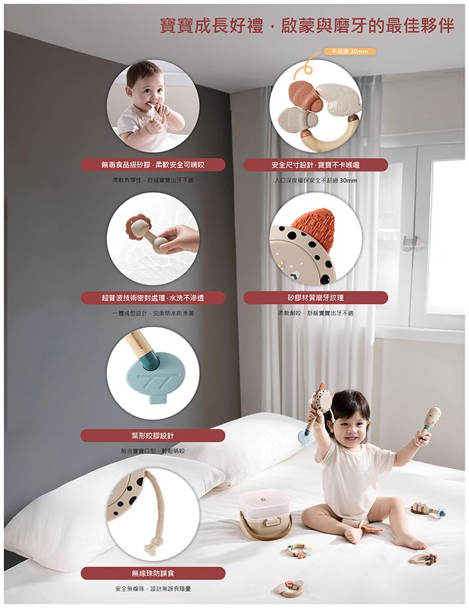 注意事項:【商品規格】 《手搖鈴四件組》 適用年齡:6個月以上 產品材質:本體-ABS樹脂100℃、熱可塑性彈性體100℃、矽膠120℃;握柄-ABS樹脂100℃、熱可塑性彈性體100℃、矽膠120℃;收納盒-120℃ 產品尺寸:收納盒 ±15x15x12.5cm;固齒器 ±9x8.5x3cm;手搖鈴 ±14.5x7.5x3cm 產地:中國 商品檢驗標識號:M3D430 《防掉落繩》 適用年齡:6個月以上 主要材質:FDA食品級鉑金矽膠 耐熱溫度:-40~200°C 產品淨重:約23g 尺寸:43x5x0.8cm 產地:中國 【注意事項】 《手搖鈴四件組》 ● 請勿在用途外使用。 ● 請務必在成年保護者視線範圍內使用。 ● 安全起見請勿使用破損、變形後的商品。 ● 嬰童睡著時,請務必取下本商品。 ● 商品請使用中性清潔劑清洗。 ● 藥液消毒時請使用嬰兒專用消毒液。 《防掉落繩》 ● 請在大人監護下使用。 ● 請勿捆綁在寶寶身體部位。 ● 開封後請務必先清潔後再使用。 ● 使用前檢查有無破損或撕裂,如有請勿再使用。 ● 繩子易導致勾住突出物,纏繞身體、四肢,請注意纏繞危險,禁止玩耍。 ● 本商品不是玩具,請勿放置在兒童可拿處、高溫下、水源處及火源處。 ● 為避免嬰兒或兒童產生窒息之危險,請於拆卸後立即將塑膠袋銷毀或遠離嬰兒或兒童。