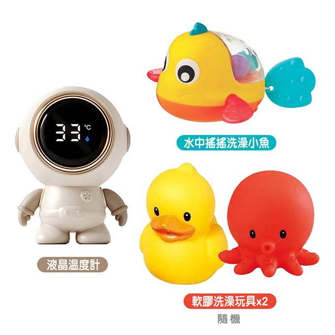 液晶溫度計太空人+軟膠洗澡玩具x2+水中搖搖洗澡小魚