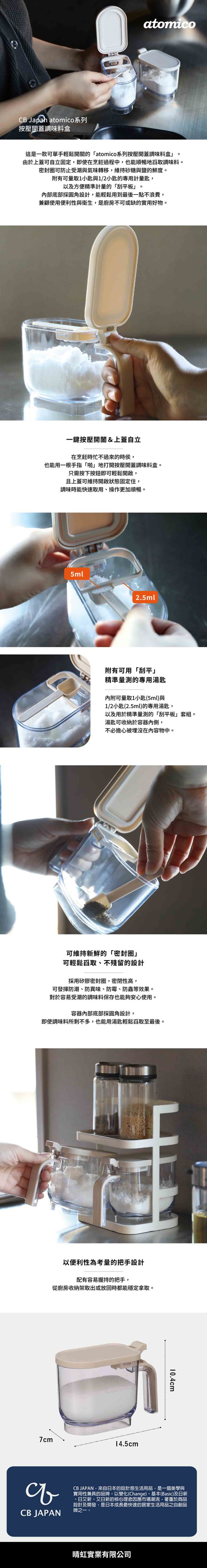這是一款可單手輕鬆開關的「atomico系列按壓開蓋調味料盒」。密封圈可防止受潮與氣味轉移,維持砂糖與鹽的鮮度。附有可量取1小匙與1/2小匙的專用湯匙,以及方便精準計量的「刮平板」。內部底部採圓角設計,能輕鬆用到最後一點不浪費。
