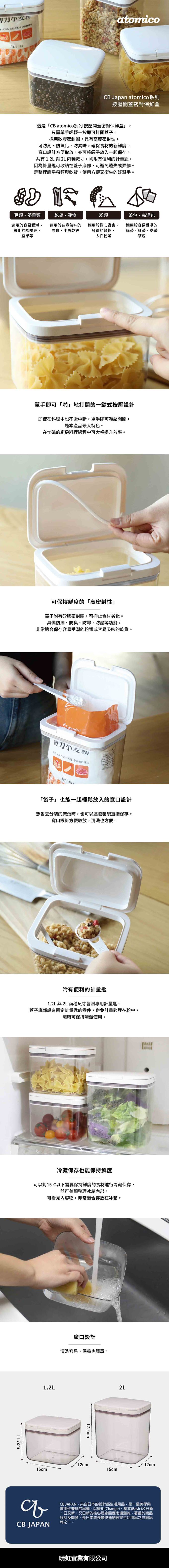 採用矽膠密封圈,具有高度密封性,可防潮、防氧化、防異味,確保食材的新鮮度。廣口設計方便取放,亦可將袋子放入一起保存。共有 1.2L 與 2L 兩種尺寸,均附有便利的計量匙,計量匙可收納在蓋子底部,可避免遺失或弄髒。