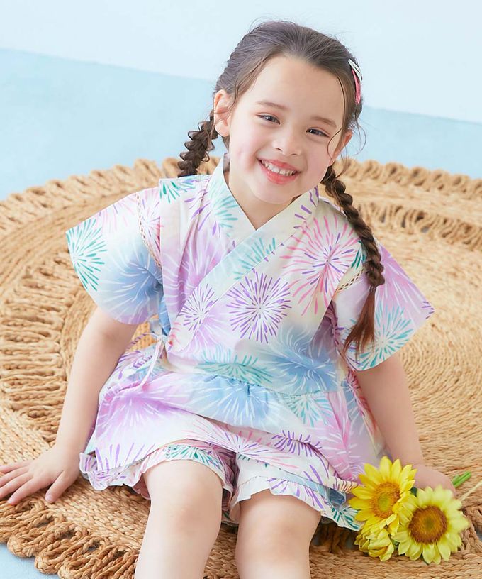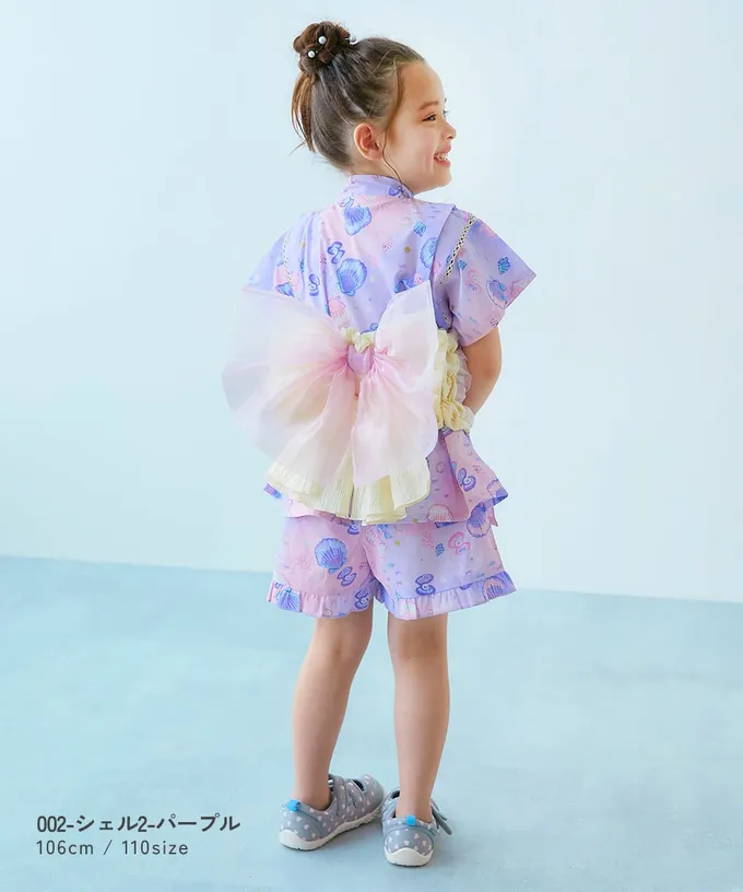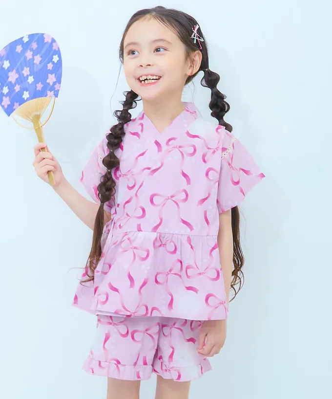 日本 devirock - 100%棉 可愛荷葉甚平套裝-漸層蝴蝶結-粉紅