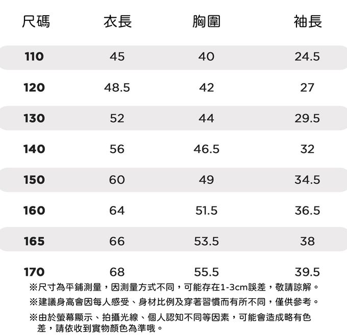 110cm、120cm、130cm、140cm、150cm、160cm、165cm、170cm