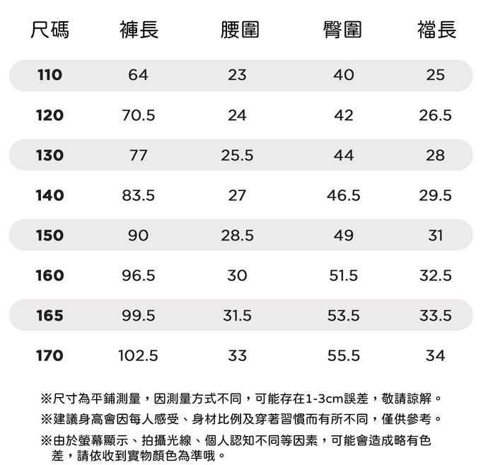 110cm、120cm、130cm、140cm、150cm、160cm、165cm、170cm