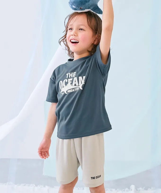 日本 devirock - 涼感速乾網眼 短袖家居服套裝-閃亮英文字-冰霧藍x淺灰