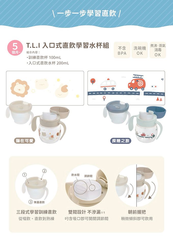 材質:材質/耐溫:〈訓練直飲杯〉杯子-聚丙烯-20℃~140℃,蓋子-矽膠-20℃~140℃;〈入口式直飲杯〉杯體-聚丙烯-20℃~110℃,頂蓋、蓋子-聚丙烯-20℃~120℃,墊圈-矽膠-20℃~140℃
