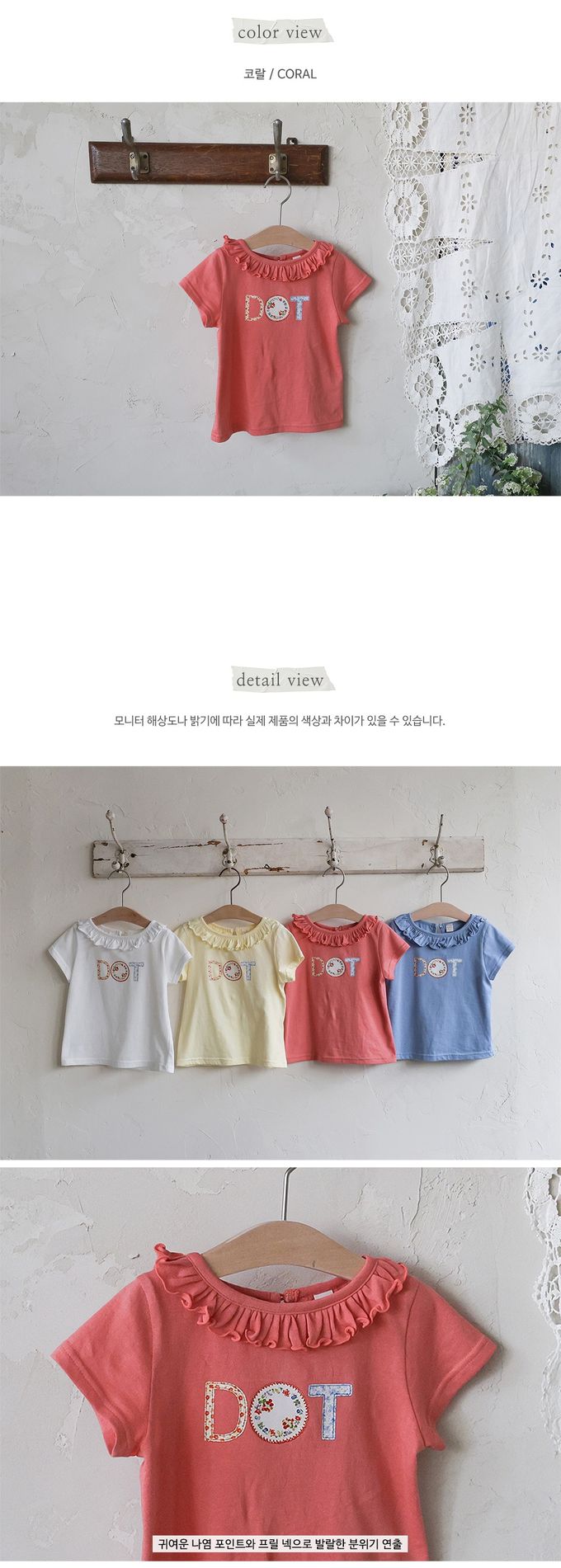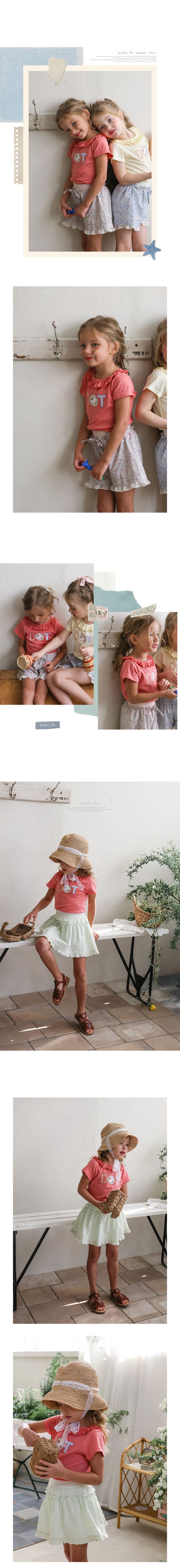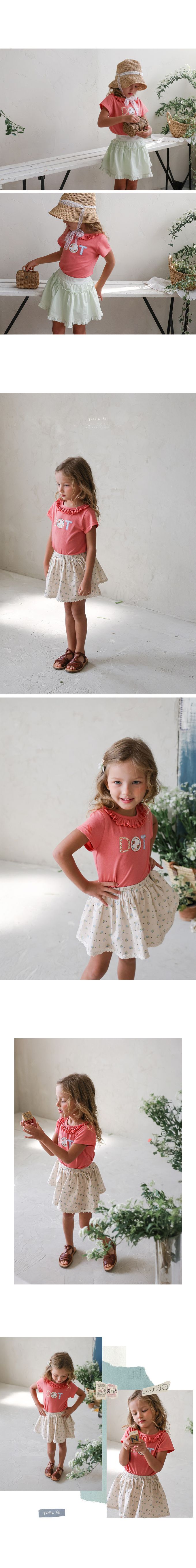 韓國南大門童裝 - Puellaflo DOT小花印荷葉領純棉短袖上衣-珊瑚紅
