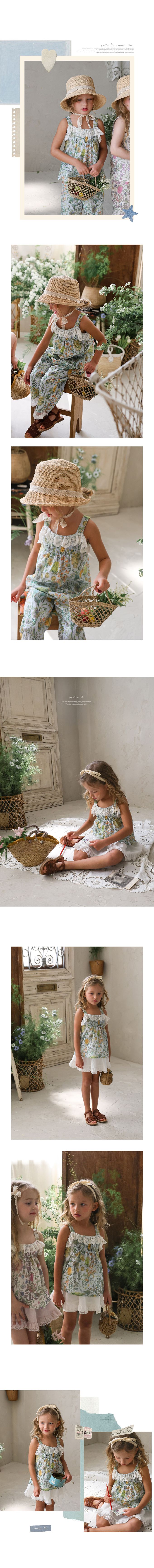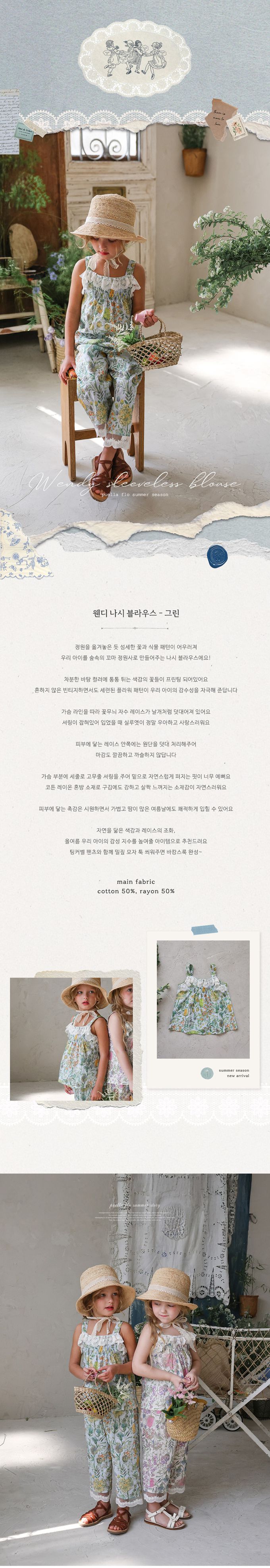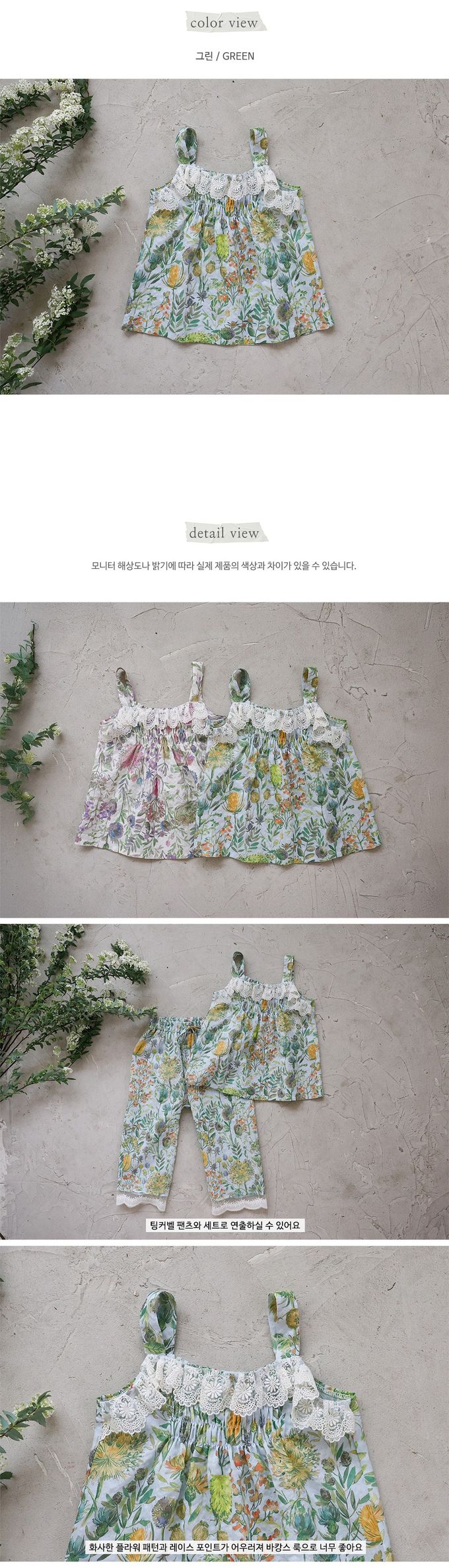 韓國南大門童裝 - Puellaflo 花園抓褶蕾絲點綴背心上衣-綠花X淺藍