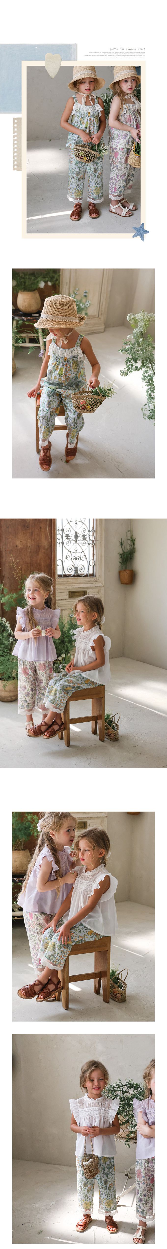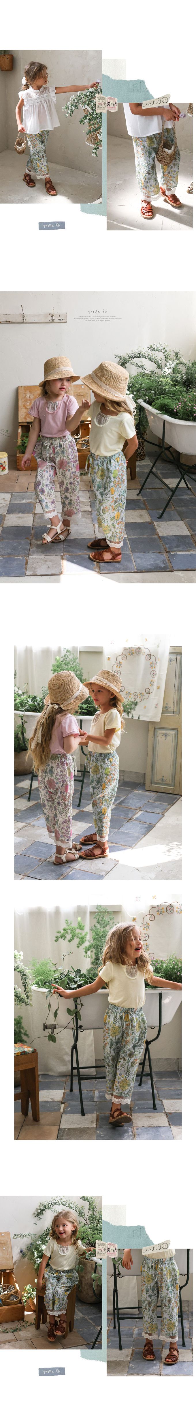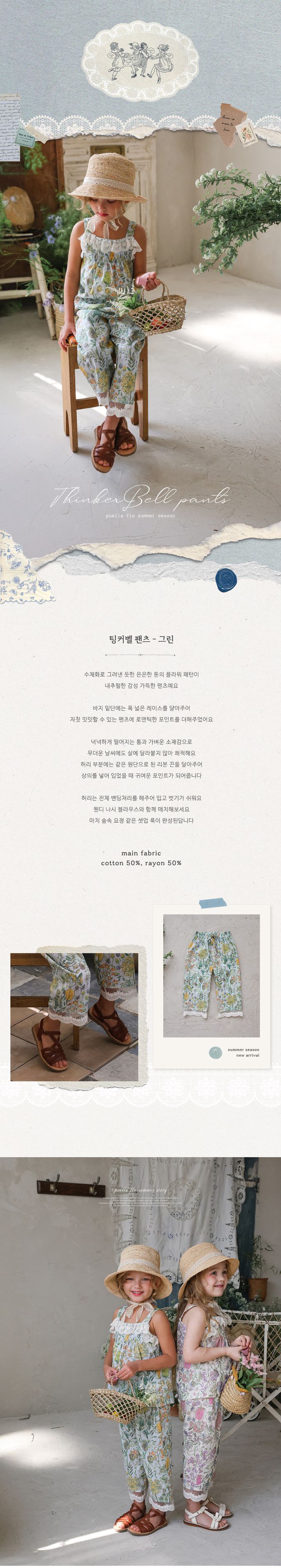韓國南大門童裝 - Puellaflo 鬆緊腰花園圖案蕾絲拼接長褲-綠花X淺藍