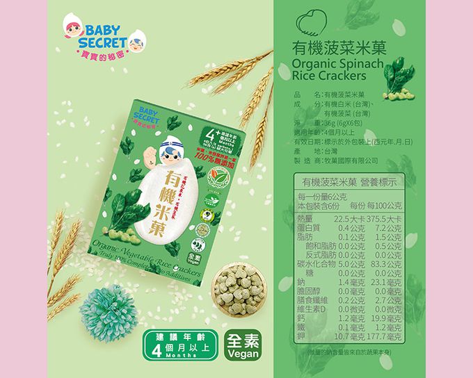 成分:《米菓袋裝》有機白米(台灣)、有機地瓜(台灣)、有機蘋果(美國/紐西蘭)、有機香蕉(台灣)、有機番茄(台灣)、有機胡蘿蔔(台灣)、有機蓮藕(台灣)、有機芭樂(台灣);《米菓盒裝》台灣-有機白米、有機香蕉、有機南瓜、有機芭樂、有機胡蘿蔔、有機菠菜、有機地瓜、有機鳳梨、有機番茄;美國、紐西蘭-有機蘋果;加拿大-有機藍莓