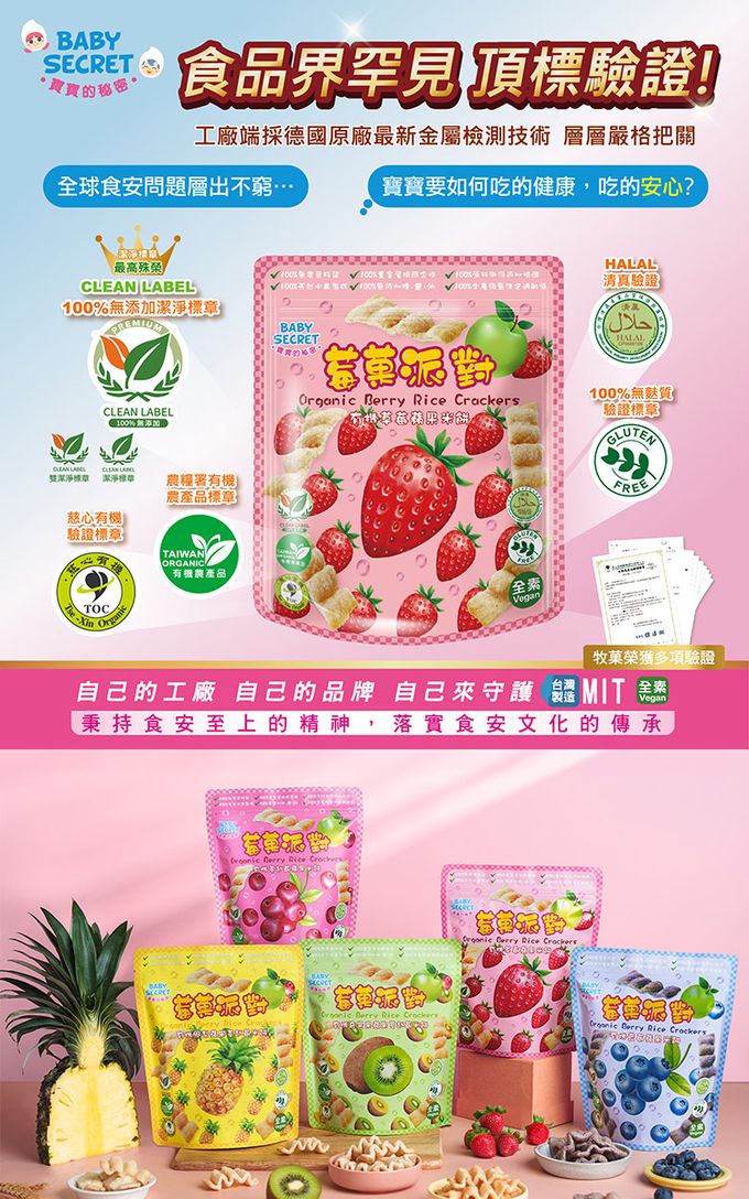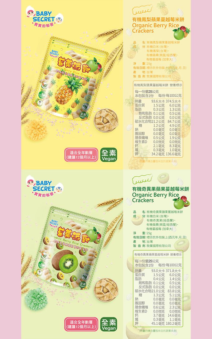 成分:有機白米(台灣)、有機蘋果(美國/紐西蘭)、有機蔓越莓(加拿大)、有機藍莓(加拿大)、有機草莓(台灣)、有機鳳梨(台灣)、有機奇異果(紐西蘭)