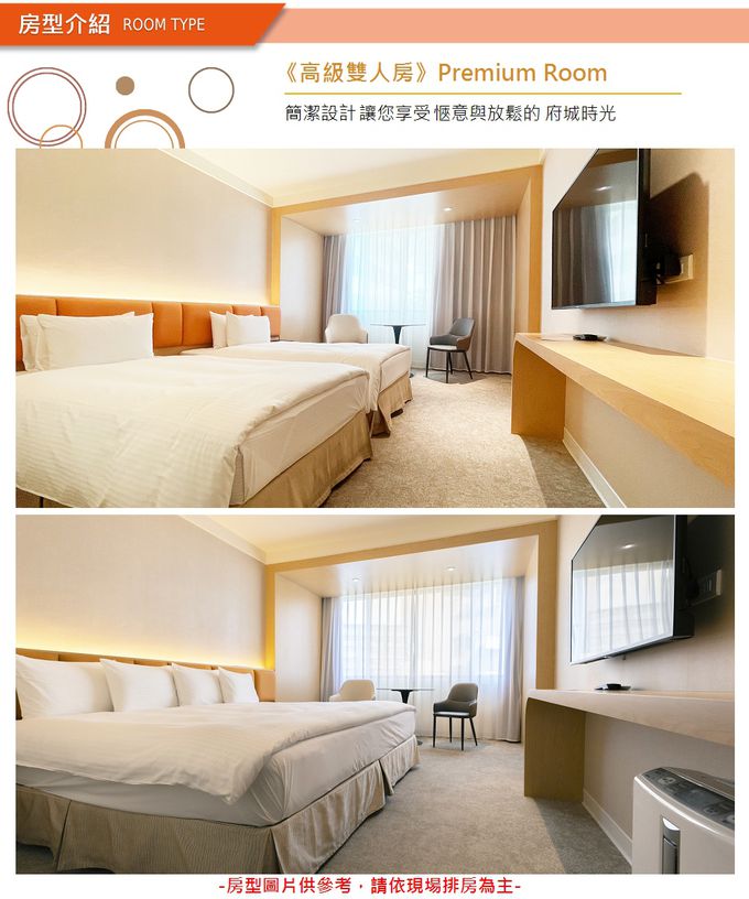 1.本券可2人住宿台南大飯店-高級雙人房(一大床兩小床均可)乙晚,含早餐兩客。