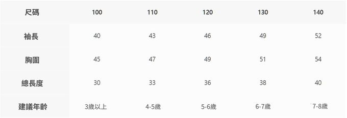 2. 每個尺寸的建議年齡、建議身高僅供參考,每位孩子發育狀況各有不同,建議參考寶貝現有的衣物/鞋子尺寸做對照。