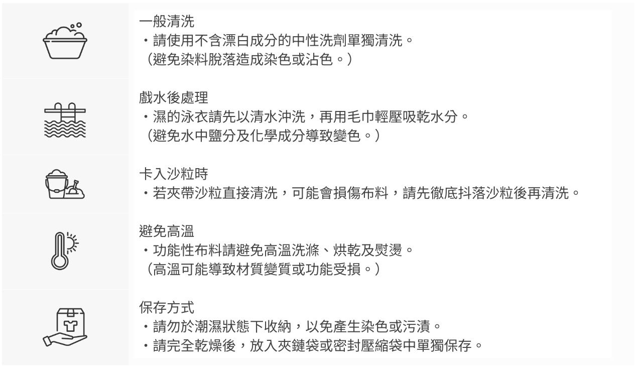 6. 若真的欲使用洗劑,請用中性洗劑清洗(不排除褪色可能)。泳衣的纖維構造較其他衣物脆弱,使用任何洗劑或30度以上溫水皆可能破壞纖維並造成褪色等現象。