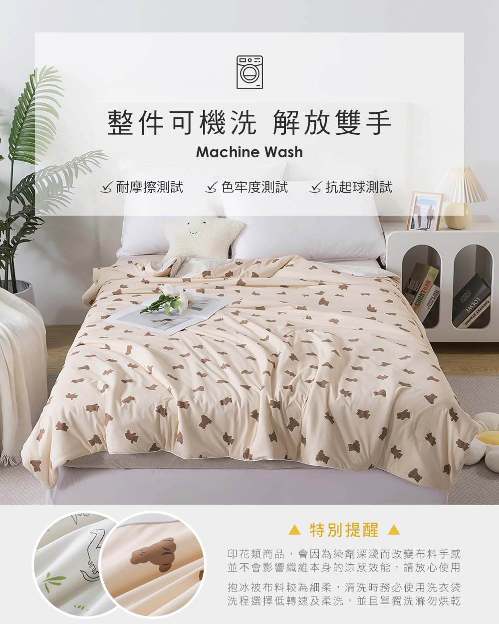 • 洗滌/清潔建議:◎清潔保養方式:可水洗、可乾洗、不可烘乾、不可漂白 ◎建議清洗時,先將洗劑溶解於水中,再將床寢放入大型洗衣袋後再清洗