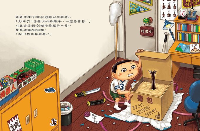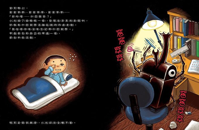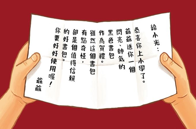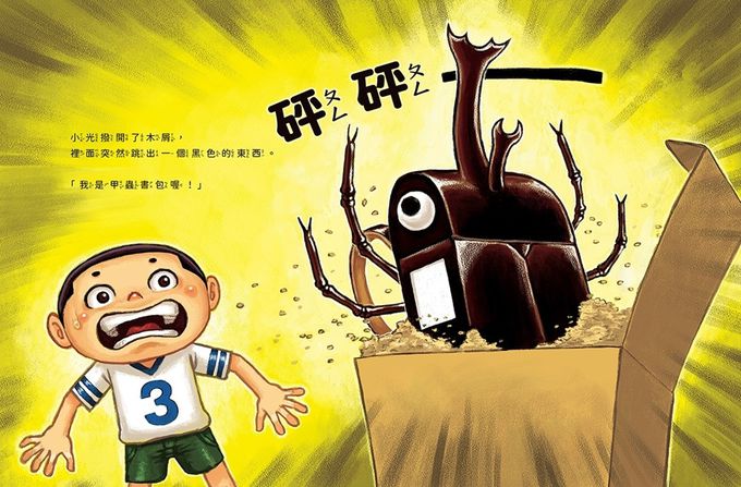 小光要上學了,爺爺送給小光一個禮物──閃閃發亮的黑色甲蟲書包!