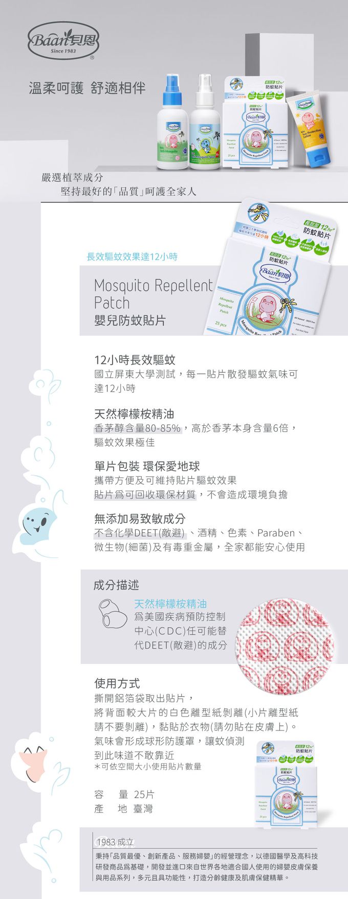 當天氣變熱蚊子也多了,媽咪每天都要跟這群不速之客奮戰,尤其是看到寶貝常常被叮成紅豆冰,真的很心疼呢!好的防蚊產品真的變成必備戰鬥品。貝恩防蚊貼片是由純天然檸檬桉精油製成,無毒性,也不含化學殺蟲劑DEET,鋁箔袋單片包裝易保存跟攜帶。