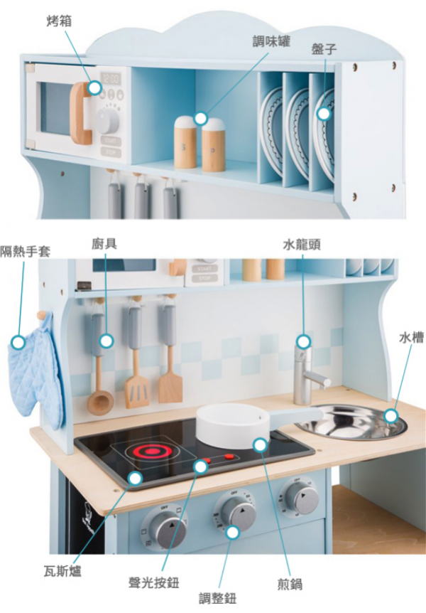聲光小主廚是比較經典的款式 ,而且超容易上手!廚台上方是微波爐、中間平台式瓦斯爐、下方是烤箱;本身有附平底鍋、鍋鏟、洗手台、胡椒罐、三個餐盤等不少配件喔。