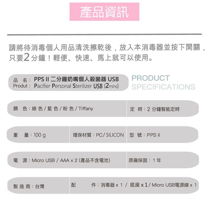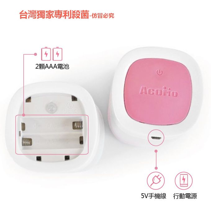 當AcoMo PPS II 殺菌器的紫外線燈管亮起,就表示正在消毒囉。按下電源開關2分鐘消完毒之後,機器會自動智能關機,幫媽咪節省用電很貼心( 小叮嚀:使用USB供電時不可以同時使用電池唷,機器會有損壞的風險!)