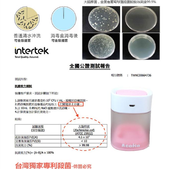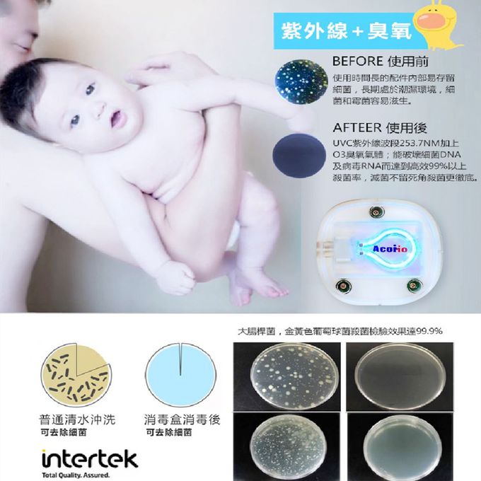 最後附上檢驗報告讓媽咪參考。UVC紫外線波段253.7nm加上O3臭氧氣體:能破壞細菌DNA及病毒RNA而達到高效99%以上殺菌率,滅菌不留死角殺菌更徹底。 AcoMo獨家超強紫外線+臭氧消毒技術,大腸桿菌、金黃色葡萄球菌殺菌檢驗效果達99.9%