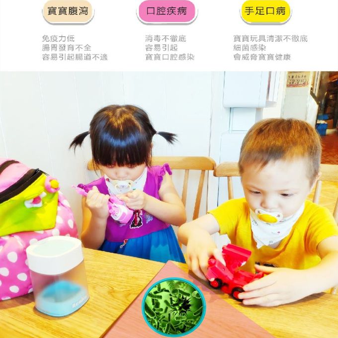 帶寶貝外出時奶嘴很容易就會掉到地上或弄髒,有了PPS II 紫外線個人殺菌器,媽咪就可以馬上把奶嘴消毒再使用!