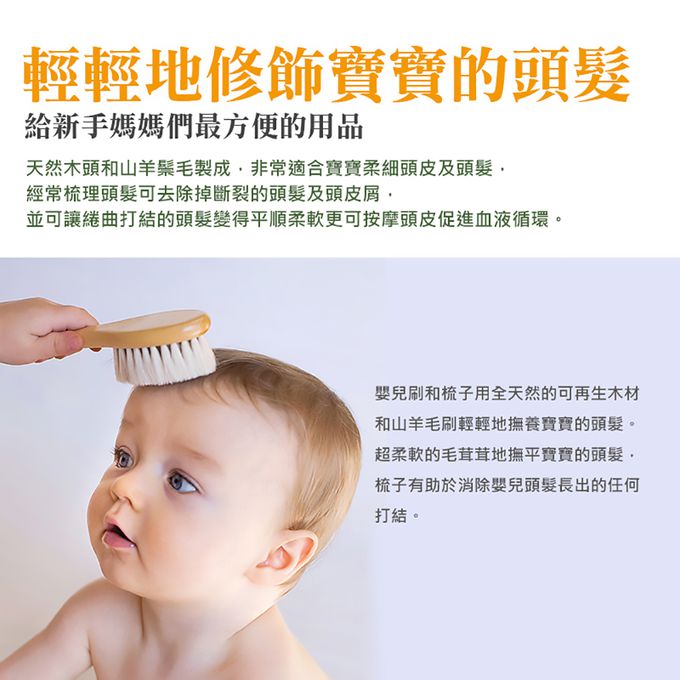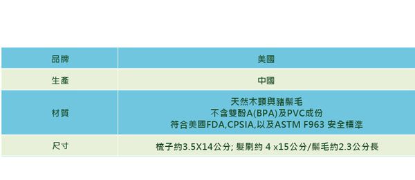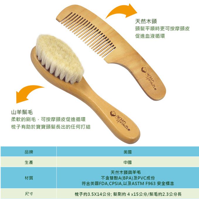 🌺 Green Sprouts 為美國知名嬰幼兒品牌,符合美國/歐洲各項食品/用品安全機構嚴格標準測試,努力致力於提供嬰幼兒安全、健康、高品質用品🌺 超優質材質:天然木頭、豬鬃毛 🌺 適合寶寶柔細的頭皮及頭髮🌺 柔軟的刷毛,可按摩頭皮,促進循環🌺 梳子有助於寶寶頭髮長出的任何打結
