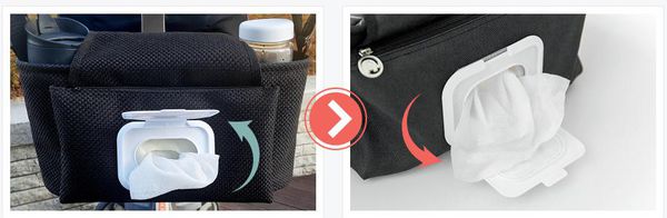 最特別的是正前方有個濕紙巾的家,是推車置物袋裡比較少見的設計喔!第一次使用的時候須要自己組裝濕紙巾抽取口,安裝方式很簡單,把蓋子上的膠膜撕下來後,瞄準洞口黏上去就 OK 了!如果稍微沒對準,撕開來重新貼也不會殘膠喔!